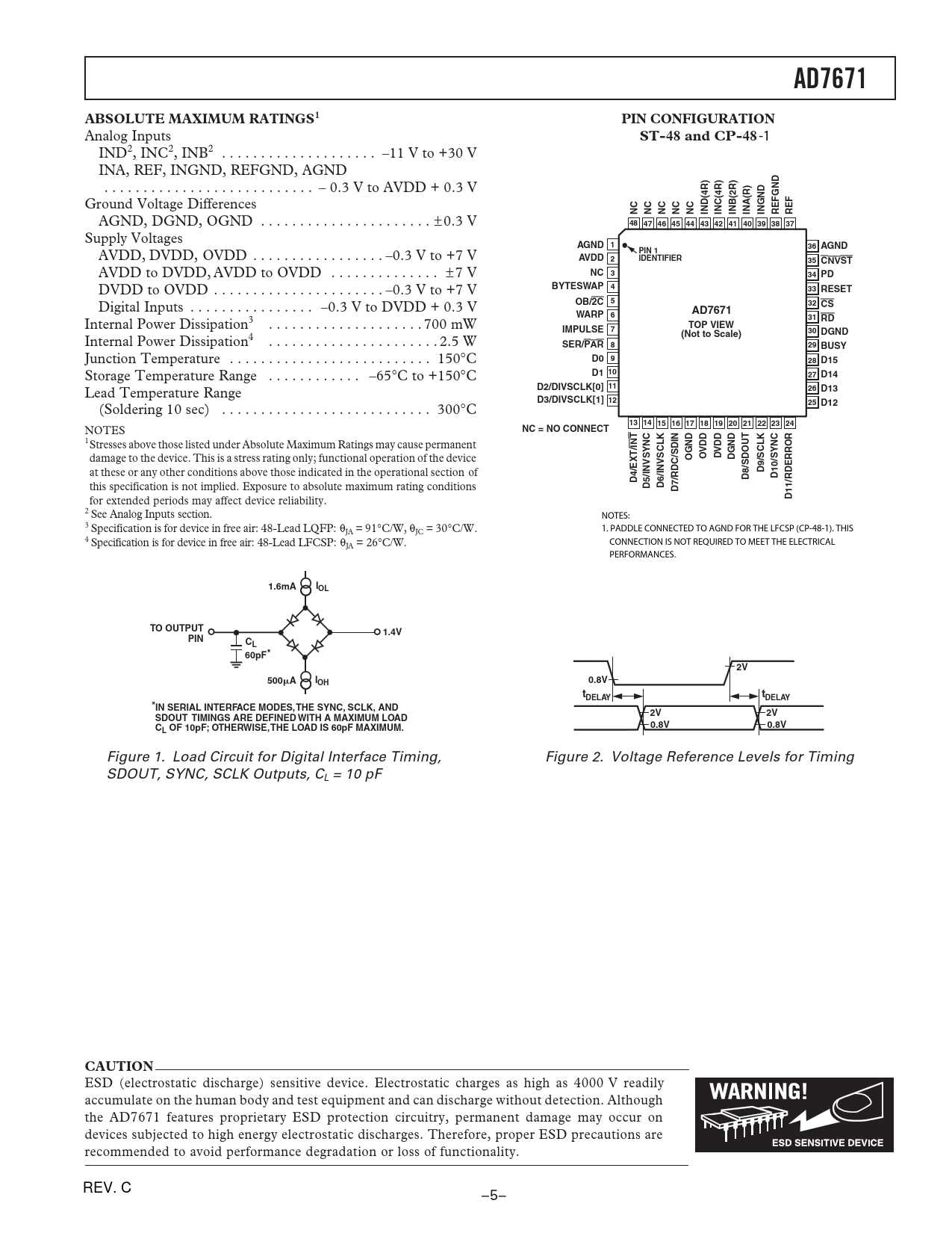 AD7671ABSOLUTE MAXIMUM RATINGS1PIN CONFIGURATION Analog Inputs ST-48 and CP-48 -1 IND2, INC2, INB2 . –11 V to +30 V INA, REF, INGND, REFGND, AGND . – 0.3 V to AVDD + 0.3 V Ground Voltage Differences NCNCNCNCNCIND(4R)INC(4R)INB(2R)INA(R)INGNDREFGNDREF AGND, DGND, OGND . . 48 ±0.3 V 47 46 45 44 43 42 41 40 39 38 37 Supply Voltages AGND 136 AGNDPIN 1 AVDD, DVDD, OVDD . –0.3 V to +7 V AVDD 2IDENTIFIER35 CNVST AVDD to DVDD, NC 334 PD AVDD to OVDD . ± 7 V BYTESWAP 433 RESET DVDD to OVDD . –0.3 V to +7 V OB/2C 532 CS Digital Inputs . –0.3 V to DVDD + 0.3 V WARPAD7671631 RD Internal Power Dissipation3 . 700 mW TOP VIEWIMPULSE 730(Not to Scale)DGND Internal Power Dissipation4 . 2.5 W SER/PAR 829 BUSY Junction Temperature . 150 D0 9 ∞C 28 D15D1 1027 D14 Storage Temperature Range . –65∞C to +150∞C D2/DIVSCLK[0] 1126 D13 Lead Temperature Range D3/DIVSCLK[1] 1225 D12 (Soldering 10 sec) . 300∞C 13 14 15 16 17 18 19 20 21 22 23 24NC = NO CONNECT NOTES DD 1Stresses above those listed under Absolute Maximum Ratings may cause permanent INTDDOR damage to the device. This is a stress rating only; functional operation of the device OGNDOVDVDGNDD9/SCLK at these or any other conditions above those indicated in the operational section of D10/SYNCD4/EXT/D8/SDOUT this specification is not implied. Exposure to absolute maximum rating conditions D5/INVSYNCD6/INVSCLKD7/RDC/SDIND11/RDERR for extended periods may affect device reliability. 2 See Analog Inputs section. NOTES: 3 Specification is for device in free air: 48-Lead LQFP: q 1. PADDLE CONNECTED TO AGND FOR THE LFCSP (CP-48-1). THIS JA = 91∞C/W, qJC = 30∞C/W. 4 Specification is for device in free air: 48-Lead LFCSP: q CONNECTION IS NOT REQUIRED TO MEET THE ELECTRICAL JA = 26∞C/W. PERFORMANCES. 1.6mAIOLTO OUTPUT1.4VPINCL 60pF*2V500IAOH0.8VttDELAYDELAY*IN SERIAL INTERFACE MODES, THE SYNC, SCLK, AND2V2VSDOUT TIMINGS ARE DEFINED WITH A MAXIMUM LOAD C0.8V0.8VL OF 10pF; OTHERWISE, THE LOAD IS 60pF MAXIMUM. Figure 1. Load Circuit for Digital Interface Timing, Figure 2. Voltage Reference Levels for Timing SDOUT, SYNC, SCLK Outputs, CL = 10 pF CAUTION ESD (electrostatic discharge) sensitive device. Electrostatic charges as high as 4000 V readily accumulate on the human body and test equipment and can discharge without detection. Although the AD7671 features proprietary ESD protection circuitry, permanent damage may occur on devices subjected to high energy electrostatic discharges. Therefore, proper ESD precautions are recommended to avoid performance degradation or loss of functionality. REV. C –5– Document Outline FEATURES APPLICATIONS GENERAL DESCRIPTION FUNCTIONAL BLOCK DIAGRAM PulSAR Selection PRODUCT HIGHLIGHTS SPECIFICATIONS TIMING SPECIFICATIONS ABSOLUTE MAXIMUM RATINGS PIN CONFIGURATION ORDERING GUIDE PIN FUNCTION DESCRIPTION DEFINITION OF SPECIFICATIONS Integral Nonlinearity Error (INL) Differential Nonlinearity Error (DNL) Full-Scale Error Bipolar Zero Error Unipolar Zero Error Spurious-Free Dynamic Range (SFDR) Effective Number of Bits (ENOB) Total Harmonic Distortion (THD) Signal-to-Noise Ratio (SNR) Signal-to-(Noise + Distortion) Ratio (S/[N+D]) Aperture Delay Transient Response Typical Performance Characteristics CIRCUIT INFORMATION CONVERTER OPERATION Modes of Operation Transfer Functions TYPICAL CONNECTION DIAGRAM Analog Inputs Driver Amplifier Choice Voltage Reference Input Scaler Reference Input (Bipolar Input Ranges) Power Supply POWER DISSIPATION CONVERSION CONTROL DIGITAL INTERFACE PARALLEL INTERFACE SERIAL INTERFACE SLAVE SERIAL INTERFACE External Clock MASTER SERIAL INTERFACE Internal Clock External Discontinuous Clock Data Read after Conversion External Clock Data Read during Conversion MICROPROCESSOR INTERFACING SPI Interface (MC68HC11) ADSP-21065L in Master Serial Interface APPLICATION HINTS Layout Evaluating the AD7671 Performance OUTLINE DIMENSIONS Revision History