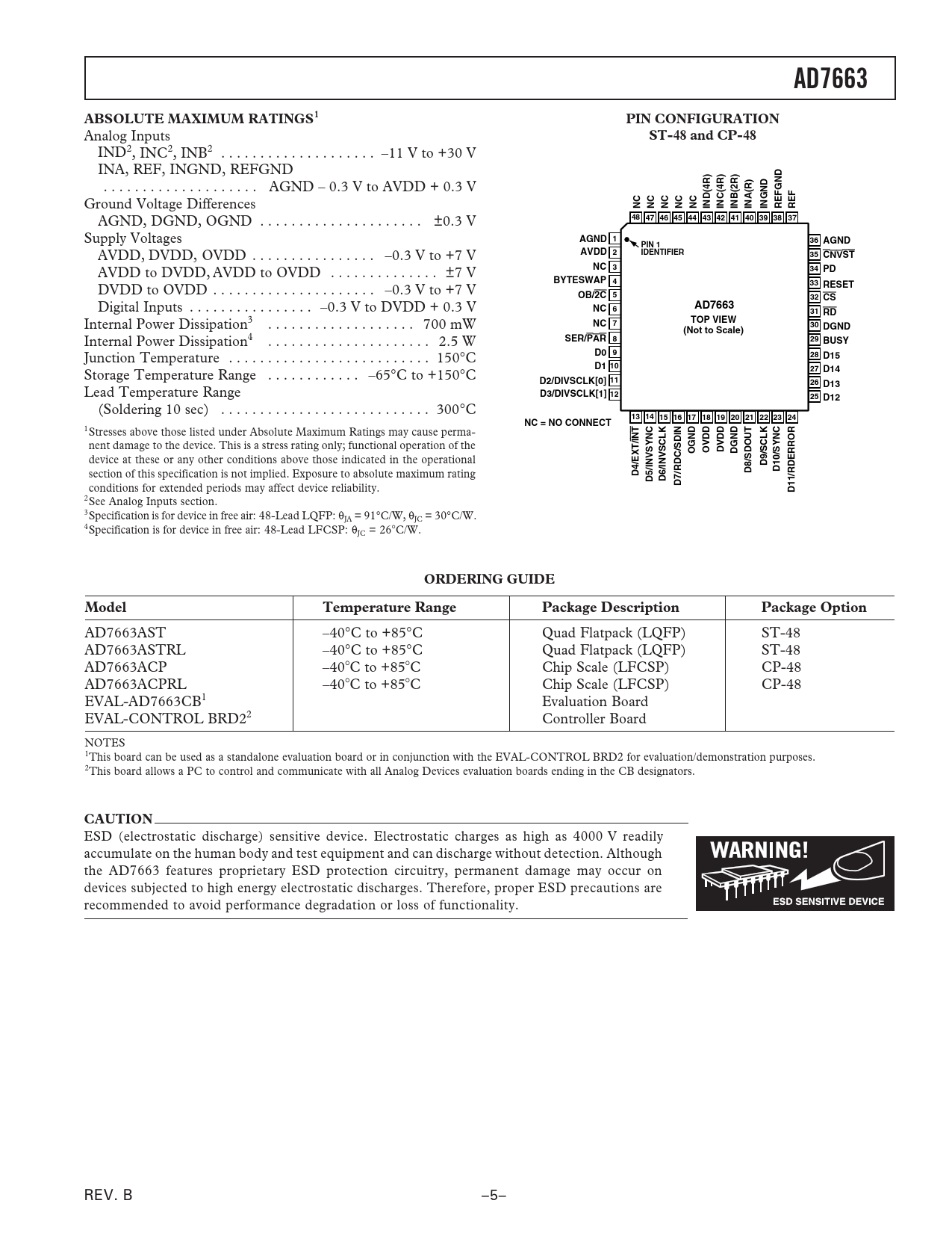 AD7663AST –40°C to +85°C Quad Flatpack (LQFP) ST-48 AD7663ASTRL –40°C to +85°C Quad Flatpack (LQFP) ST-48 AD7663ACP –40⬚C to +85⬚C Chip Scale (LFCSP) CP-48 AD7663ACPRL –40⬚C to +85⬚C Chip Scale (LFCSP) CP-48 EVAL-AD7663CB1 Evaluation Board EVAL-CONTROL BRD22 Controller Board NOTES 1This board can be used as a standalone evaluation board or in conjunction with the EVAL-CONTROL BRD2 for evaluation/demonstration purposes. 2This board allows a PC to control and communicate with all Analog Devices evaluation boards ending in the CB designators.