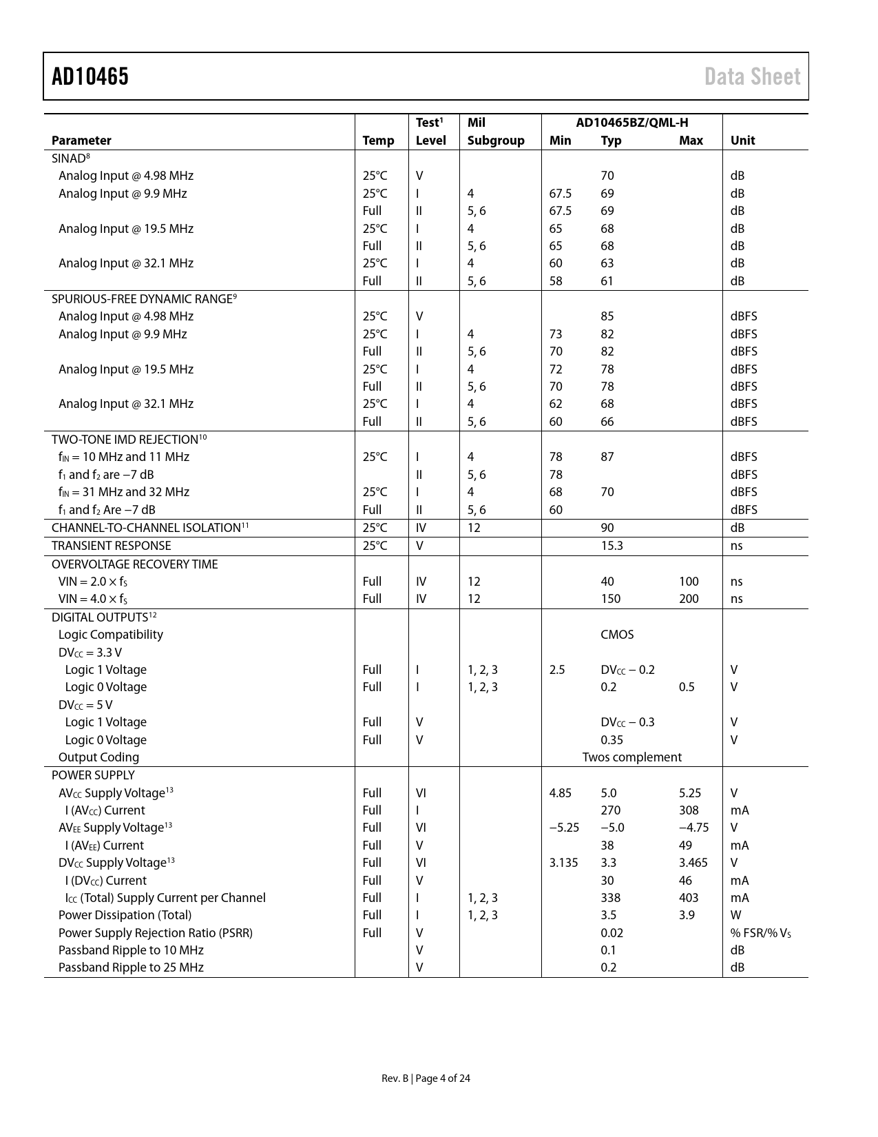 AD10465. Data Sheet. Test1. Mil. AD10465BZ/QML-H. Parameter. Temp. Level. Subgroup. Min. Typ. Max. Unit