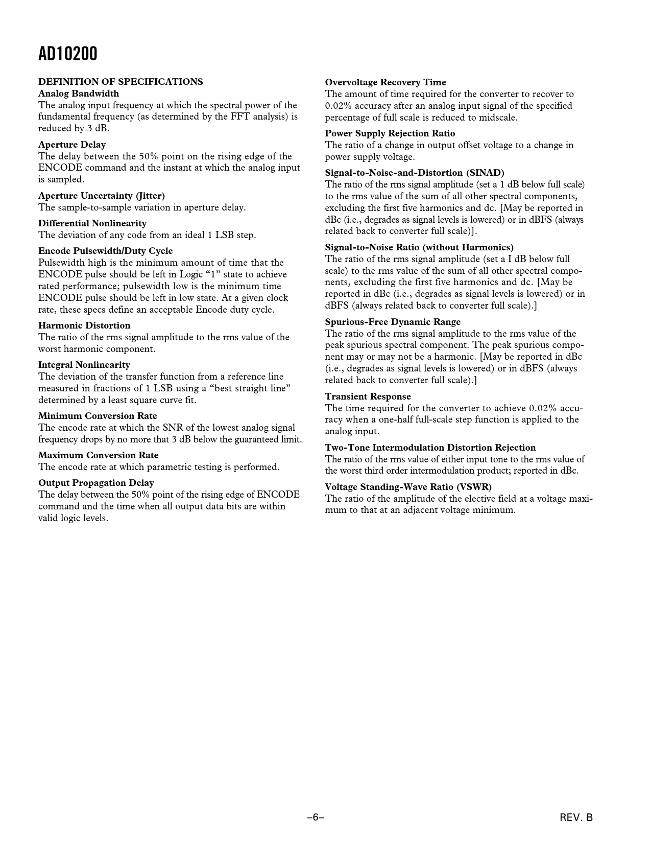 AD10200DEFINITION OF SPECIFICATIONSOvervoltage Recovery TimeAnalog Bandwidth The amount of time required for the converter to recover to The analog input frequency at which the spectral power of the 0.02% accuracy after an analog input signal of the specified fundamental frequency (as determined by the FFT analysis) is percentage of full scale is reduced to midscale. reduced by 3 dB. Power Supply Rejection RatioAperture Delay The ratio of a change in output offset voltage to a change in The delay between the 50% point on the rising edge of the power supply voltage. ENCODE command and the instant at which the analog input Signal-to-Noise-and-Distortion (SINAD) is sampled. The ratio of the rms signal amplitude (set a 1 dB below full scale) Aperture Uncertainty (Jitter) to the rms value of the sum of all other spectral components, The sample-to-sample variation in aperture delay. excluding the first five harmonics and dc. [May be reported in Differential Nonlinearity dBc (i.e., degrades as signal levels is lowered) or in dBFS (always The deviation of any code from an ideal 1 LSB step. related back to converter full scale)]. Encode Pulsewidth/Duty CycleSignal-to-Noise Ratio (without Harmonics) Pulsewidth high is the minimum amount of time that the The ratio of the rms signal amplitude (set a I dB below full ENCODE pulse should be left in Logic “1” state to achieve scale) to the rms value of the sum of all other spectral compo- rated performance; pulsewidth low is the minimum time nents, excluding the first five harmonics and dc. [May be ENCODE pulse should be left in low state. At a given clock reported in dBc (i.e., degrades as signal levels is lowered) or in rate, these specs define an acceptable Encode duty cycle. dBFS (always related back to converter full scale).] Harmonic DistortionSpurious-Free Dynamic Range The ratio of the rms signal amplitude to the rms value of the The ratio of the rms signal amplitude to the rms value of the worst harmonic component. peak spurious spectral component. The peak spurious compo- nent may or may not be a harmonic. [May be reported in dBc Integral Nonlinearity (i.e., degrades as signal levels is lowered) or in dBFS (always The deviation of the transfer function from a reference line related back to converter full scale).] measured in fractions of 1 LSB using a “best straight line” determined by a least square curve fit. Transient Response The time required for the converter to achieve 0.02% accu- Minimum Conversion Rate racy when a one-half full-scale step function is applied to the The encode rate at which the SNR of the lowest analog signal analog input. frequency drops by no more that 3 dB below the guaranteed limit. Two-Tone Intermodulation Distortion RejectionMaximum Conversion Rate The ratio of the rms value of either input tone to the rms value of The encode rate at which parametric testing is performed. the worst third order intermodulation product; reported in dBc. Output Propagation DelayVoltage Standing-Wave Ratio (VSWR) The delay between the 50% point of the rising edge of ENCODE The ratio of the amplitude of the elective field at a voltage maxi- command and the time when all output data bits are within mum to that at an adjacent voltage minimum. valid logic levels. –6– REV. B