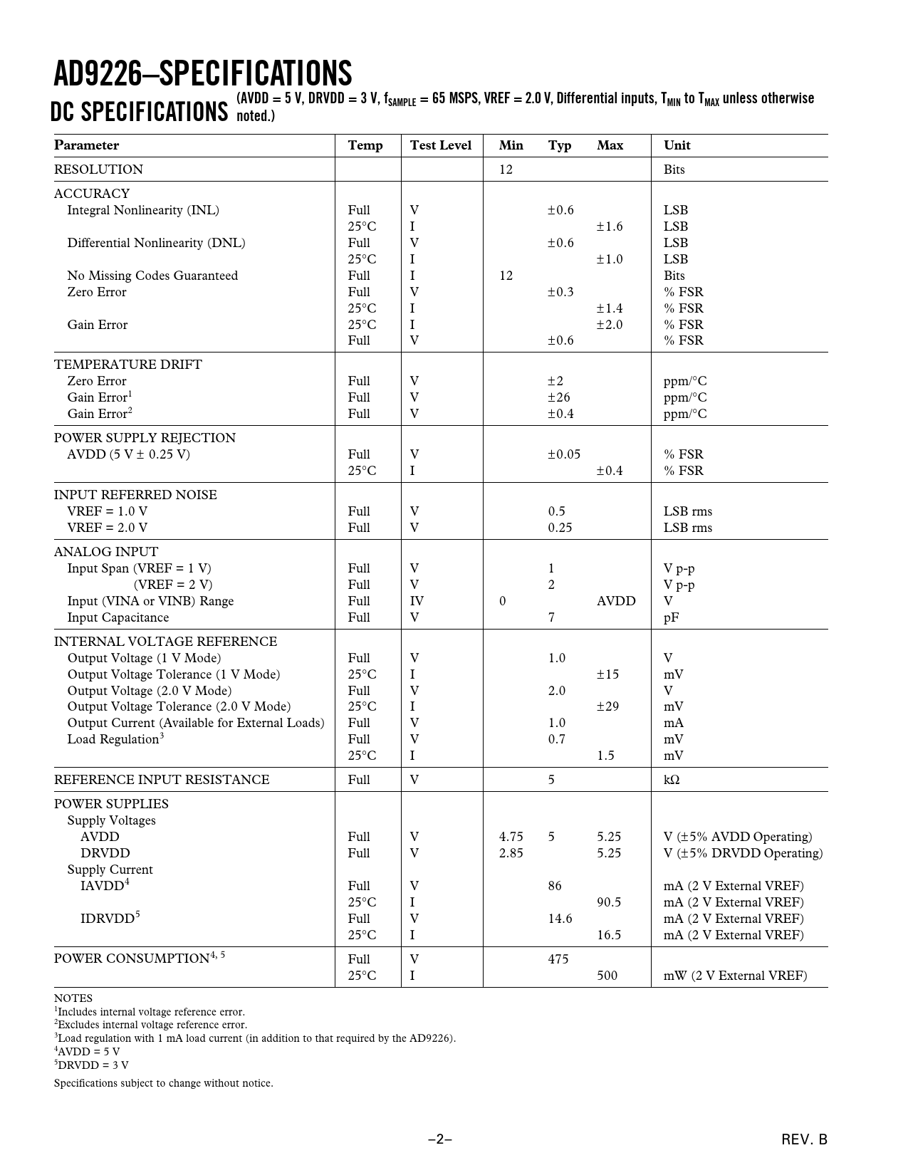 RESOLUTION 12 Bits ACCURACY Integral Nonlinearity (INL) Full V ±0.6 LSB 25°C I ±1.6 LSB Differential Nonlinearity (DNL) Full V ±0.6 LSB 25°C I ±1.0 LSB No Missing Codes Guaranteed Full I 12 Bits Zero Error Full V ±0.3 % FSR 25°C I ±1.4 % FSR Gain Error 25°C I ±2.0 % FSR Full V ±0.6 % FSR TEMPERATURE DRIFT Zero Error Full V ± 2 ppm/°C Gain Error1 Full V ±26 ppm/°C Gain Error2 Full V ±0.4 ppm/°C POWER SUPPLY REJECTION AVDD (5 V ± 0.25 V) Full V ±0.05 % FSR 25°C I ±0.4 % FSR INPUT REFERRED NOISE VREF = 1.0 V Full V 0.5 LSB rms VREF = 2.0 V Full V 0.25 LSB rms ANALOG INPUT Input Span (VREF = 1 V) Full V 1 V p-p (VREF = 2 V) Full V 2 V p-p Input (VINA or VINB) Range Full IV 0 AVDD V Input Capacitance Full V 7 pF INTERNAL VOLTAGE REFERENCE Output Voltage (1 V Mode) Full V 1.0 V Output Voltage Tolerance (1 V Mode) 25°C I ±15 mV Output Voltage (2.0 V Mode) Full V 2.0 V Output Voltage Tolerance (2.0 V Mode) 25°C I ±29 mV Output Current (Available for External Loads) Full V 1.0 mA Load Regulation3 Full V 0.7 mV 25°C I 1.5 mV REFERENCE INPUT RESISTANCE Full V 5 kΩ POWER SUPPLIES Supply Voltages AVDD Full V 4.75 5 5.25 V (± 5% AVDD Operating) DRVDD Full V 2.85 5.25 V (± 5% DRVDD Operating) Supply Current IAVDD4 Full V 86 mA (2 V External VREF) 25°C I 90.5 mA (2 V External VREF) IDRVDD5 Full V 14.6 mA (2 V External VREF) 25°C I 16.5 mA (2 V External VREF) POWER CONSUMPTION4, 5 Full V 475 25°C I 500 mW (2 V External VREF) NOTES 1Includes internal voltage reference error. 2Excludes internal voltage reference error. 3Load regulation with 1 mA load current (in addition to that required by the AD9226). 4AVDD = 5 V 5DRVDD = 3 V Specifications subject to change without notice. –2– REV. B