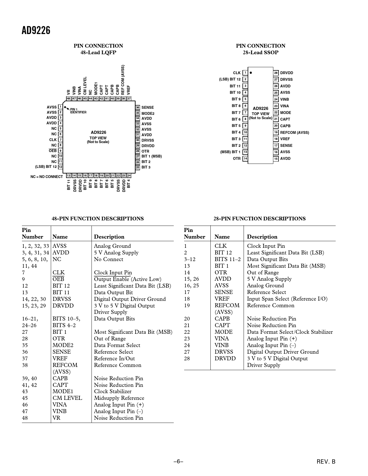 AD9226. PIN CONNECTION. 48-Lead LQFP. 28-Lead SSOP. CLK. 28 DRVDD. (LSB) BIT 12. 27 DRVSS. BIT 11. 26 AVDD. BIT 10. 25 AVSS. VINB. VINA. CM LEVEL
