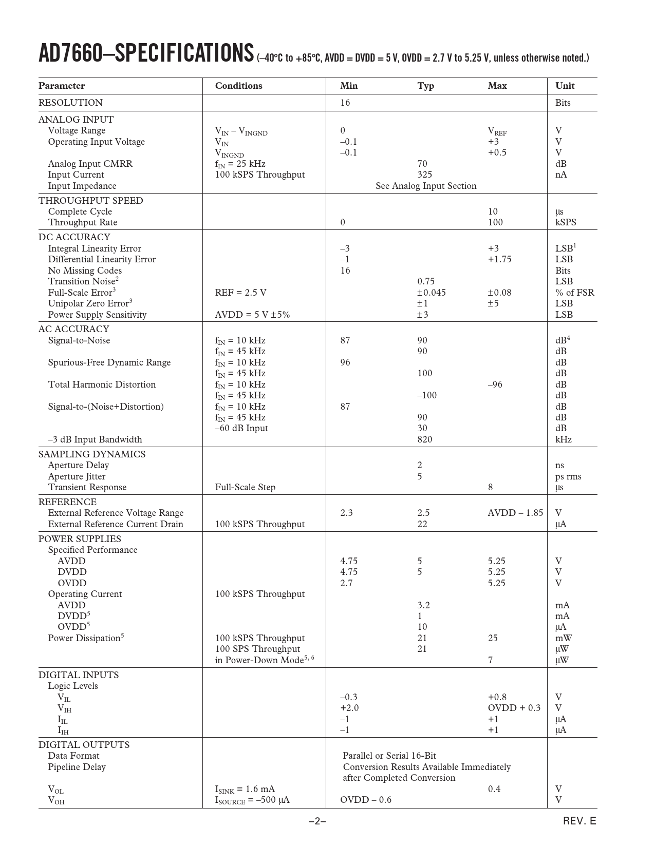 AD7660–SPECIFICATIONS(–40. C to +85. C, AVDD = DVDD = 5 V, OVDD = 2.7 V to 5.25 V, unless otherwise noted.). Parameter