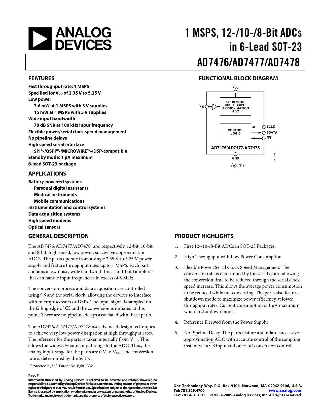 1 MSPS, 12-/10-/8-Bit ADCs. in 6-Lead SOT-23. AD7476/AD7477/AD7478. FEATURES. FUNCTIONAL BLOCK DIAGRAM