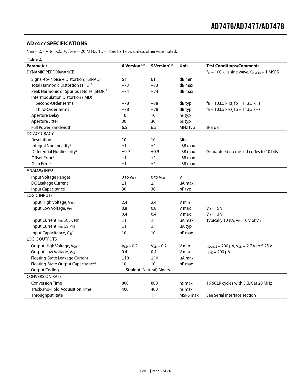 AD7476/AD7477/AD7478. AD7477 SPECIFICATIONS. Table 2. Parameter. A Version. ,2 S. Version1,2. Unit. Test Conditions/Comments