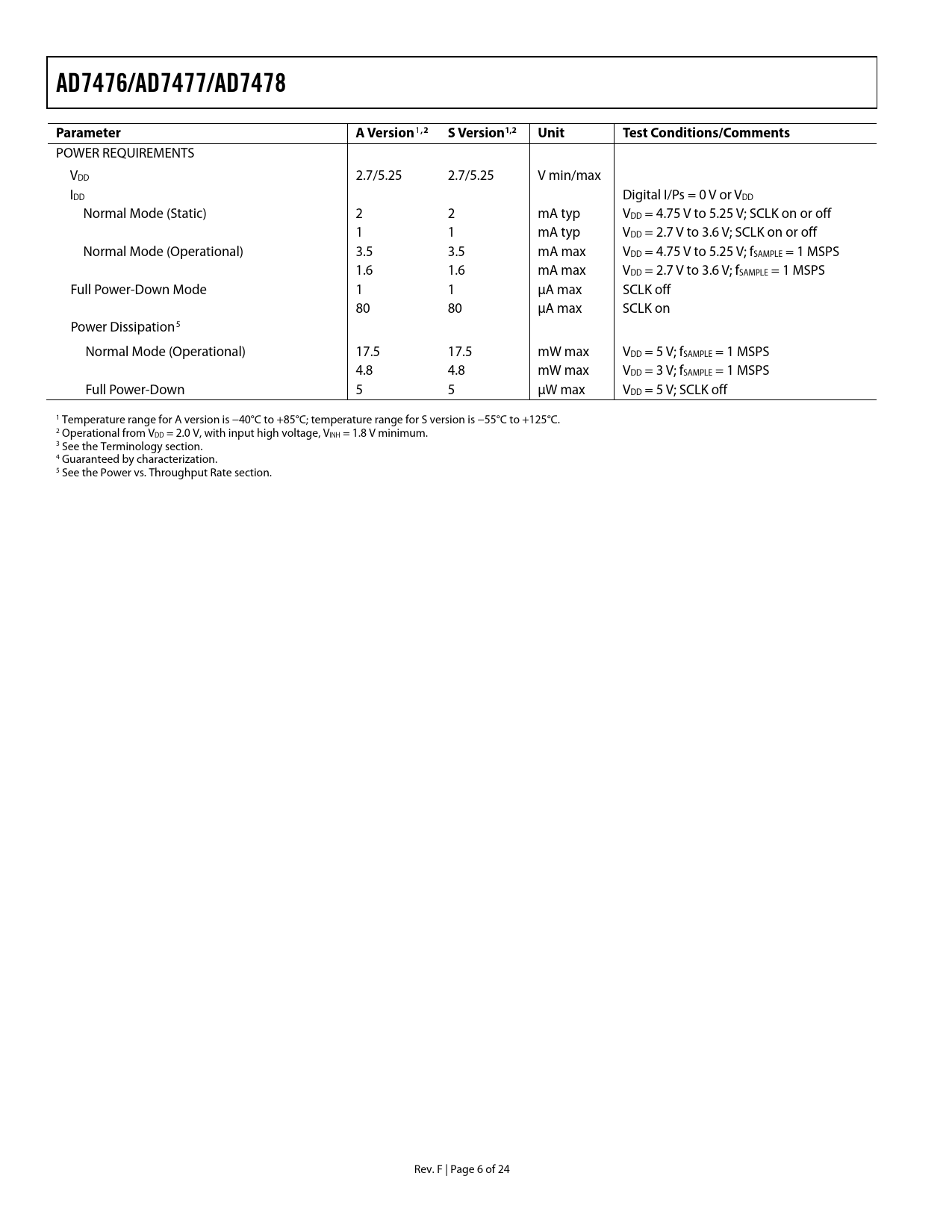 link to page 6 link to page 6 link to page 12 link to page 12 AD7476/AD7477/AD7478ParameterA Version 1 ,2 SVersion1,2UnitTest Conditions/Comments POWER REQUIREMENTS VDD 2.7/5.25 2.7/5.25 V min/max IDD Digital I/Ps = 0 V or VDD Normal Mode (Static) 2 2 mA typ VDD = 4.75 V to 5.25 V; SCLK on or off 1 1 mA typ VDD = 2.7 V to 3.6 V; SCLK on or off Normal Mode (Operational) 3.5 3.5 mA max VDD = 4.75 V to 5.25 V; fSAMPLE = 1 MSPS 1.6 1.6 mA max VDD = 2.7 V to 3.6 V; fSAMPLE = 1 MSPS Full Power-Down Mode 1 1 μA max SCLK off 80 80 μA max SCLK on Power Dissipation5 Normal Mode (Operational) 17.5 17.5 mW max VDD = 5 V; fSAMPLE = 1 MSPS 4.8 4.8 mW max VDD = 3 V; fSAMPLE = 1 MSPS Full Power-Down 5 5 μW max VDD = 5 V; SCLK off 1 Temperature range for A version is −40°C to +85°C; temperature range for S version is −55°C to +125°C. 2 Operational from VDD = 2.0 V, with input high voltage, VINH = 1.8 V minimum. 3 See the Terminology section. 4 Guaranteed by characterization. 5 See the Power vs. Throughput Rate section. Rev. F | Page 6 of 24 Document Outline FEATURES APPLICATIONS GENERAL DESCRIPTION FUNCTIONAL BLOCK DIAGRAM PRODUCT HIGHLIGHTS TABLE OF CONTENTS REVISION HISTORY SPECIFICATIONS AD7476 SPECIFICATIONS AD7477 SPECIFICATIONS AD7478 SPECIFICATIONS TIMING SPECIFICATIONS ABSOLUTE MAXIMUM RATINGS ESD CAUTION PIN CONFIGURATION AND FUNCTION DESCRIPTIONS TYPICAL PERFORMANCE CHARACTERISTICS TERMINOLOGY THEORY OF OPERATION CIRCUIT INFORMATION CONVERTER OPERATION ADC TRANSFER FUNCTION TYPICAL CONNECTION DIAGRAM Analog Input Digital Input MODES OF OPERATION Normal Mode Power-Down Mode Power-Up Time POWER VS. THROUGHPUT RATE SERIAL INTERFACE MICROPROCESSOR INTERFACING AD7476/AD7477/AD7478 to TMS320C5x/C54x Interface AD7476/AD7477/AD7478 to ADSP-21xx Interface AD7476/AD7477/AD7478 to DSP56xxx Interface AD7476/AD7477/AD7478 to MC68HC16 Interface OUTLINE DIMENSIONS ORDERING GUIDE