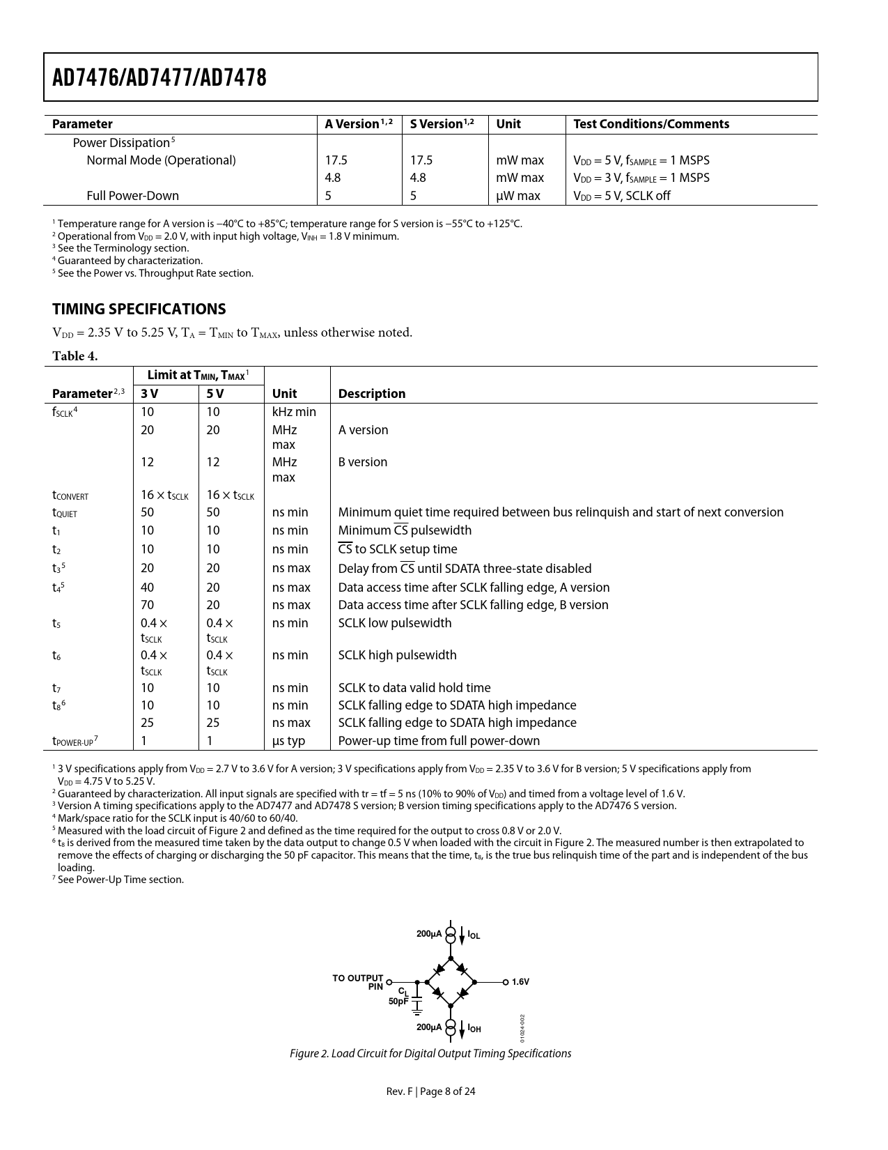 AD7476/AD7477/AD7478. Parameter. A Version1,2 S. Version1,2. Unit. Test Conditions/Comments. TIMING SPECIFICATIONS. Table 4. Limit at T