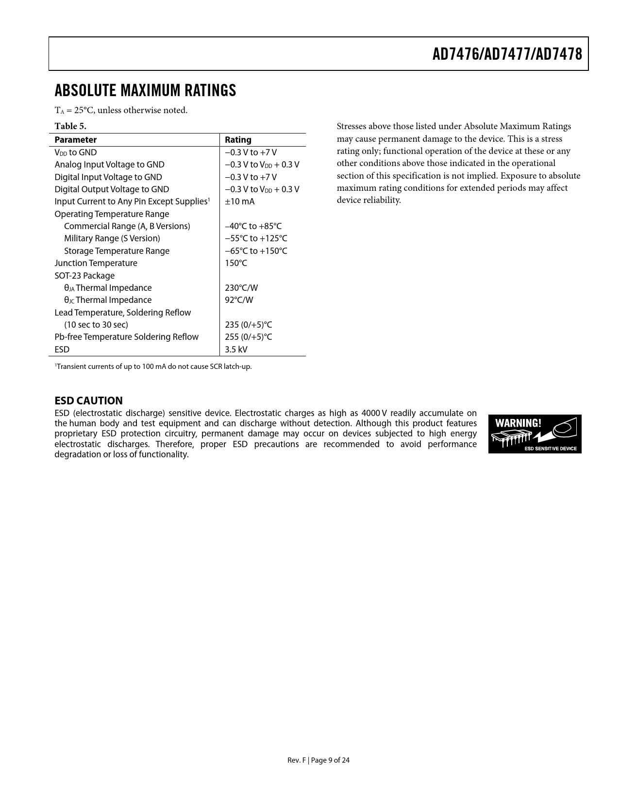 AD7476/AD7477/AD7478 ABSOLUTE MAXIMUM RATINGS Table 5 Parameter Rating ESD CAUTION