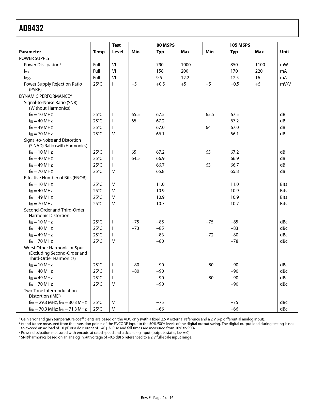 AD9432 Test 80 MSPS 105 MSPS Parameter Temp Level Min Typ Max Min Typ Max Unit