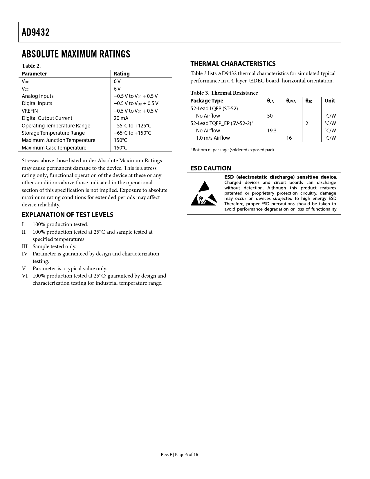 AD9432 ABSOLUTE MAXIMUM RATINGS THERMAL CHARACTERISTICS Table 2 Parameter Rating Table 3 Thermal Resistance Package Type
