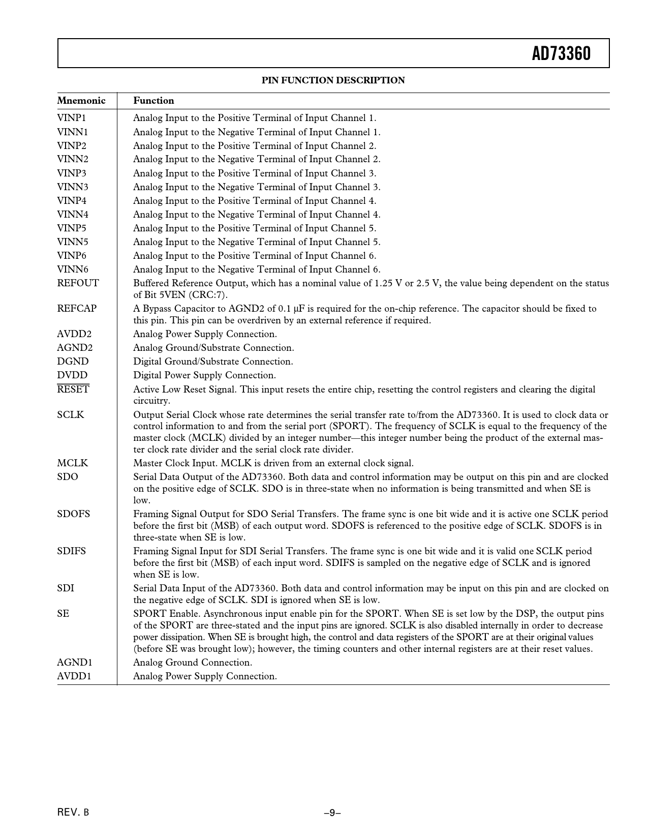 AD73360. PIN FUNCTION DESCRIPTION. Mnemonic. Function
