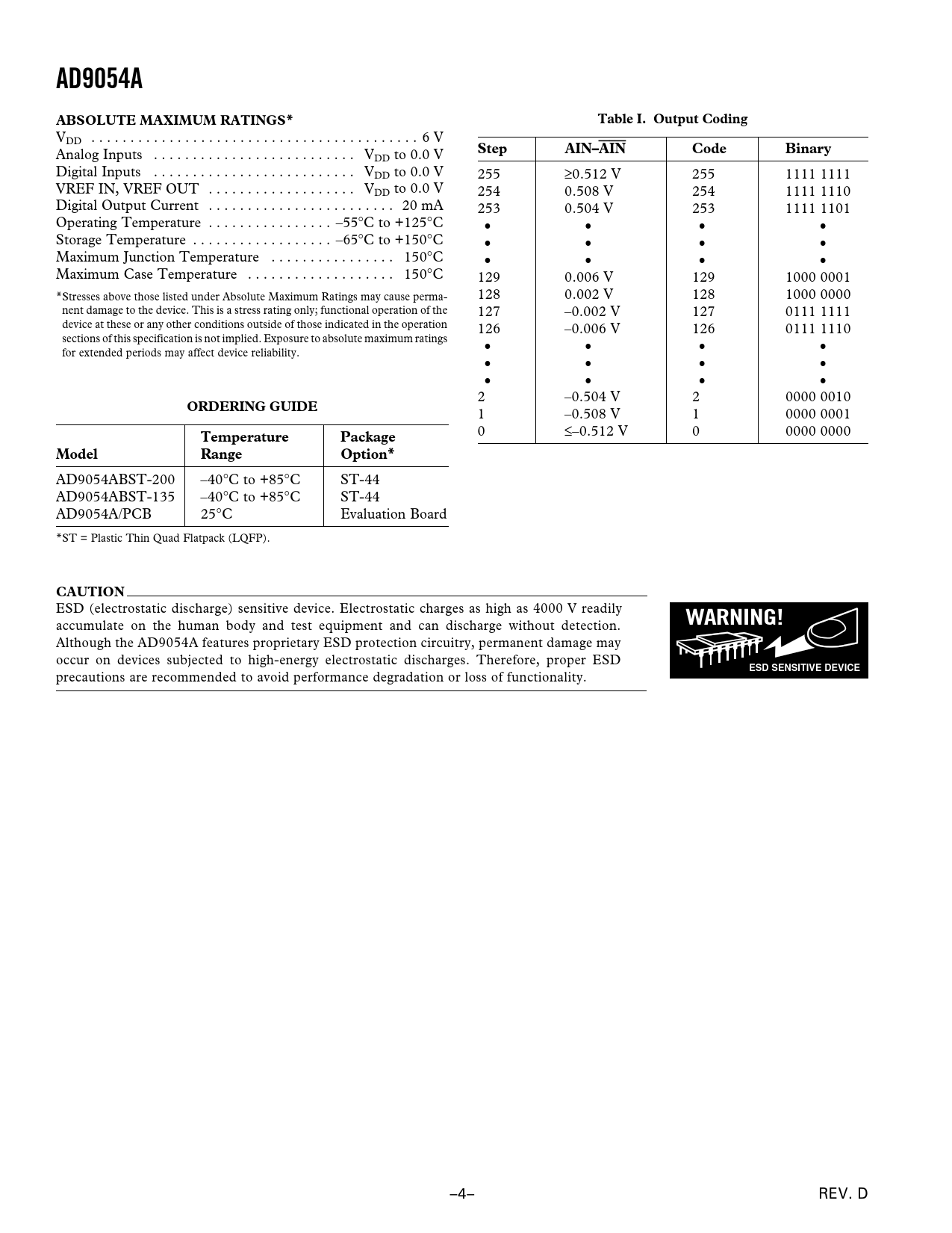 AD9054A. ABSOLUTE MAXIMUM RATINGS*. Table I. Output Coding. Step. AIN–AIN. Code. Binary. ORDERING GUIDE. Temperature. Package. Model. Range