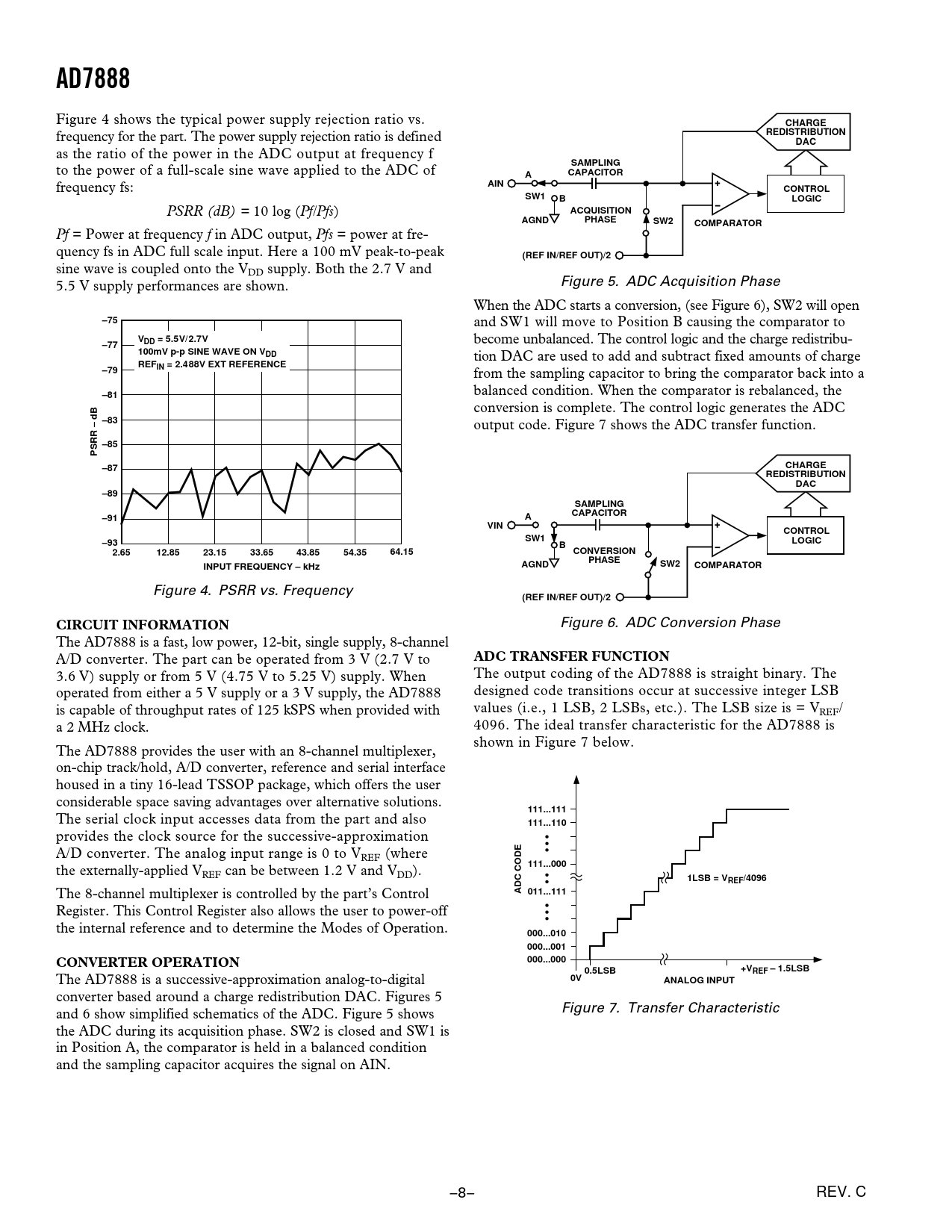 AD7888 Figure 4 shows the typical power supply rejection ratio vs. CHARGE frequency for the part. The power supply rejection ratio is defined REDISTRIBUTIONDAC as the ratio of the power in the ADC output at frequency f SAMPLING to the power of a full-scale sine wave applied to the ADC of CAPACITORA frequency fs: AINCONTROLSW1BLOGIC PSRR (dB) = 10 log (Pf/Pfs) ACQUISITIONAGNDPHASESW2COMPARATOR Pf = Power at frequency f in ADC output, Pfs = power at fre- quency fs in ADC full scale input. Here a 100 mV peak-to-peak (REF IN/REF OUT)/2 sine wave is coupled onto the VDD supply. Both the 2.7 V and 5.5 V supply performances are shown. Figure 5. ADC Acquisition Phase When the ADC starts a conversion, (see Figure 6), SW2 will open –75 and SW1 will move to Position B causing the comparator to VDD = 5.5V/2.7V become unbalanced. The control logic and the charge redistribu- –77100mV p-p SINE WAVE ON VDD tion DAC are used to add and subtract fixed amounts of charge REFIN = 2.488V EXT REFERENCE–79 from the sampling capacitor to bring the comparator back into a balanced condition. When the comparator is rebalanced, the –81 conversion is complete. The control logic generates the ADC dB – –83 output code. Figure 7 shows the ADC transfer function. –85PSRR–87CHARGEREDISTRIBUTIONDAC–89SAMPLINGCAPACITOR–91AVINCONTROLSW1–93LOGICB2.6512.8523.1533.6543.8554.3564.15CONVERSIONPHASEINPUT FREQUENCY – kHzAGNDSW2COMPARATOR Figure 4. PSRR vs. Frequency (REF IN/REF OUT)/2CIRCUIT INFORMATION Figure 6. ADC Conversion Phase The AD7888 is a fast, low power, 12-bit, single supply, 8-channel A/D converter. The part can be operated from 3 V (2.7 V to ADC TRANSFER FUNCTION 3.6 V) supply or from 5 V (4.75 V to 5.25 V) supply. When The output coding of the AD7888 is straight binary. The operated from either a 5 V supply or a 3 V supply, the AD7888 designed code transitions occur at successive integer LSB is capable of throughput rates of 125 kSPS when provided with values (i.e., 1 LSB, 2 LSBs, etc.). The LSB size is = VREF/ a 2 MHz clock. 4096. The ideal transfer characteristic for the AD7888 is shown in Figure 7 below. The AD7888 provides the user with an 8-channel multiplexer, on-chip track/hold, A/D converter, reference and serial interface housed in a tiny 16-lead TSSOP package, which offers the user considerable space saving advantages over alternative solutions. 111...111 The serial clock input accesses data from the part and also 111...110 provides the clock source for the successive-approximation A/D converter. The analog input range is 0 to VREF (where 111...000 the externally-applied VREF can be between 1.2 V and VDD). 1LSB = VREF/4096 The 8-channel multiplexer is controlled by the part’s Control ADC CODE 011...111 Register. This Control Register also allows the user to power-off the internal reference and to determine the Modes of Operation. 000...010000...001CONVERTER OPERATION000...0000.5LSB+VREF – 1.5LSB The AD7888 is a successive-approximation analog-to-digital 0VANALOG INPUT converter based around a charge redistribution DAC. Figures 5 and 6 show simplified schematics of the ADC. Figure 5 shows Figure 7. Transfer Characteristic the ADC during its acquisition phase. SW2 is closed and SW1 is in Position A, the comparator is held in a balanced condition and the sampling capacitor acquires the signal on AIN. –8– REV. C