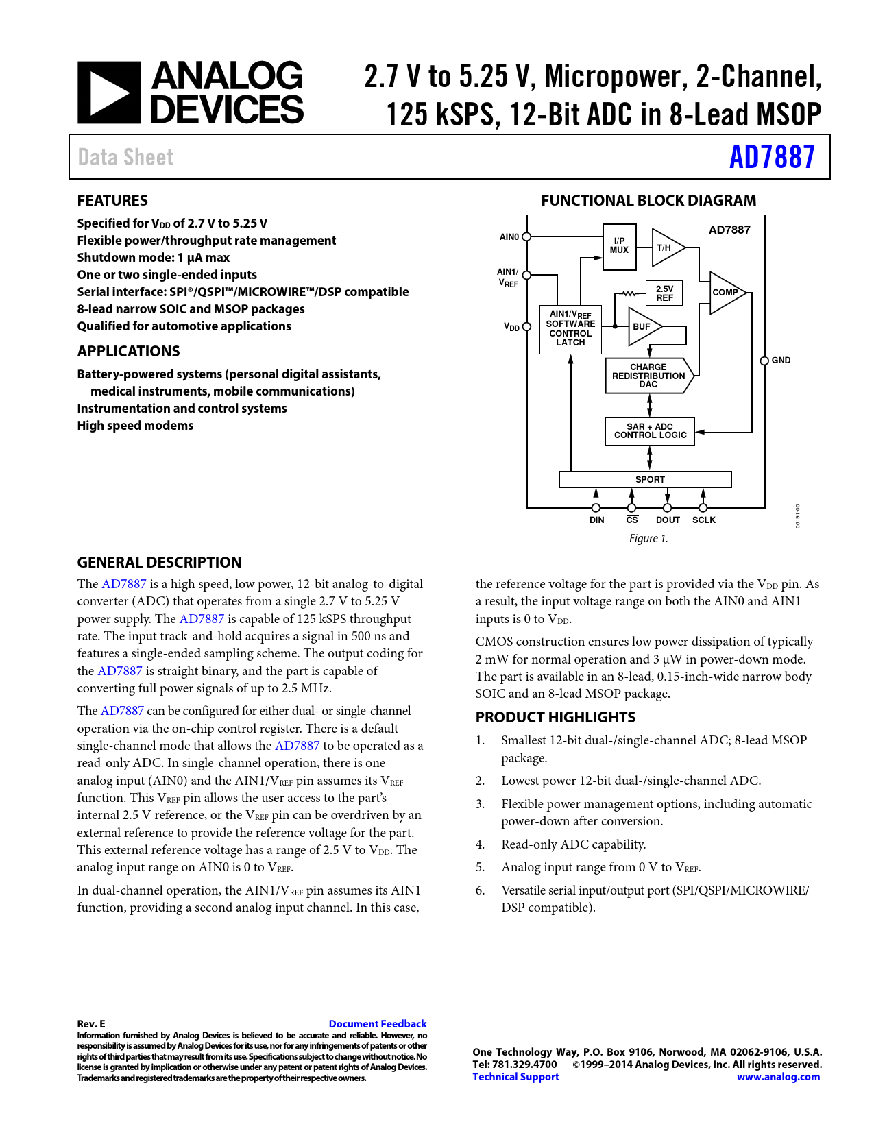 2.7 V to 5.25 V, Micropower, 2-Channel,. 125 kSPS, 12-Bit ADC in 8-Lead MSOP. Data Sheet. AD7887. FEATURES