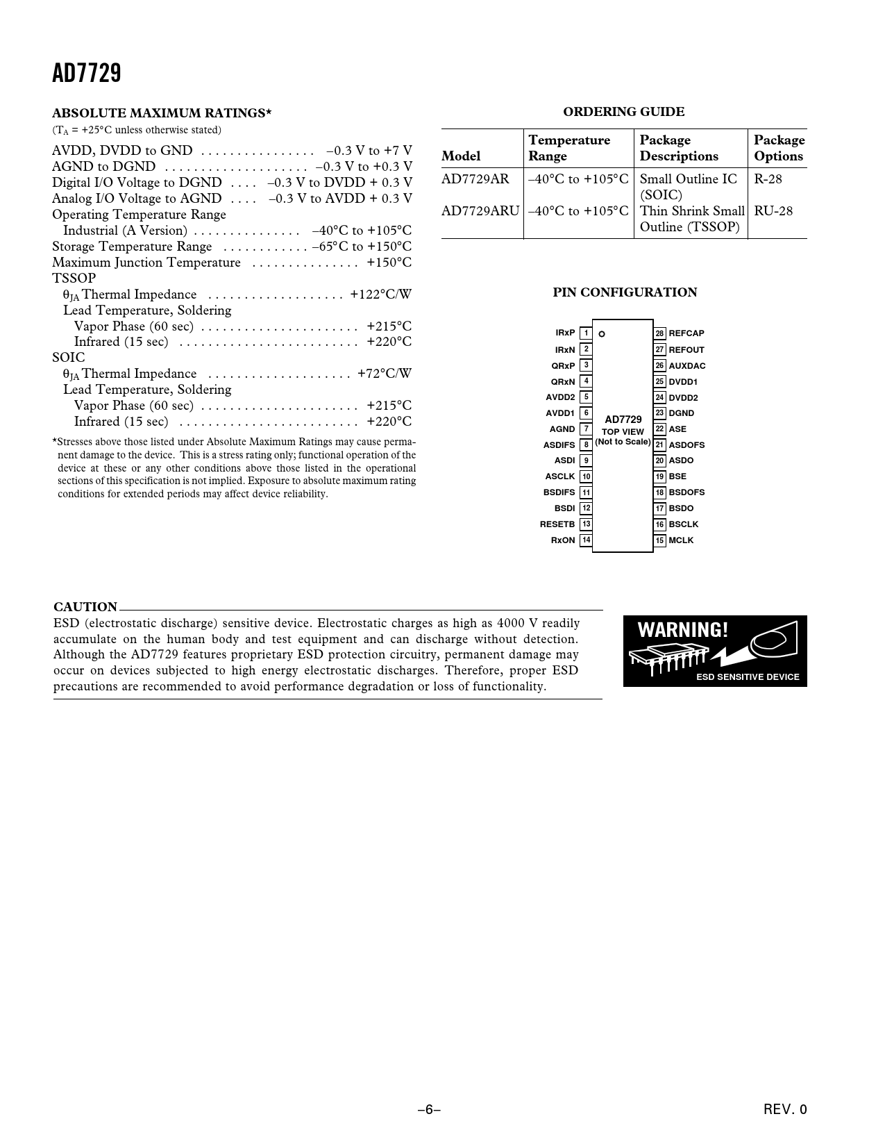 AD7729ABSOLUTE MAXIMUM RATINGS*ORDERING GUIDE (TA = +25°C unless otherwise stated) TemperaturePackagePackage AVDD, DVDD to GND . –0.3 V to +7 V ModelRangeDescriptionsOptions AGND to DGND . –0.3 V to +0.3 V Digital I/O Voltage to DGND . –0.3 V to DVDD + 0.3 V AD7729AR –40°C to +105°C Small Outline IC R-28 Analog I/O Voltage to AGND . –0.3 V to AVDD + 0.3 V (SOIC) Operating Temperature Range AD7729ARU –40°C to +105°C Thin Shrink Small RU-28 Industrial (A Version) . –40°C to +105°C Outline (TSSOP) Storage Temperature Range . –65°C to +150°C Maximum Junction Temperature . +150°C TSSOP θ PIN CONFIGURATION JA Thermal Impedance . +122°C/W Lead Temperature, Soldering Vapor Phase (60 sec) . +215°C IRxP128 REFCAP Infrared (15 sec) . +220°C IRxN227 REFOUT SOIC QRxP326 AUXDAC θJA Thermal Impedance . +72°C/W QRxN425 DVDD1 Lead Temperature, Soldering AVDD2524 DVDD2 Vapor Phase (60 sec) . +215°C AVDD1623 DGND Infrared (15 sec) . +220°C AD7729AGND7TOP VIEW22 ASE *Stresses above those listed under Absolute Maximum Ratings may cause perma- (Not to Scale)ASDIFS821 ASDOFS nent damage to the device. This is a stress rating only; functional operation of the ASDI920 ASDO device at these or any other conditions above those listed in the operational sections of this specification is not implied. Exposure to absolute maximum rating ASCLK 1019 BSE conditions for extended periods may affect device reliability. BSDIFS 1118 BSDOFSBSDI 1217 BSDORESETB 1316 BSCLKRxON 1415 MCLKCAUTION ESD (electrostatic discharge) sensitive device. Electrostatic charges as high as 4000 V readily WARNING! accumulate on the human body and test equipment and can discharge without detection. Although the AD7729 features proprietary ESD protection circuitry, permanent damage may occur on devices subjected to high energy electrostatic discharges. Therefore, proper ESD ESD SENSITIVE DEVICE precautions are recommended to avoid performance degradation or loss of functionality. –6– REV. 0