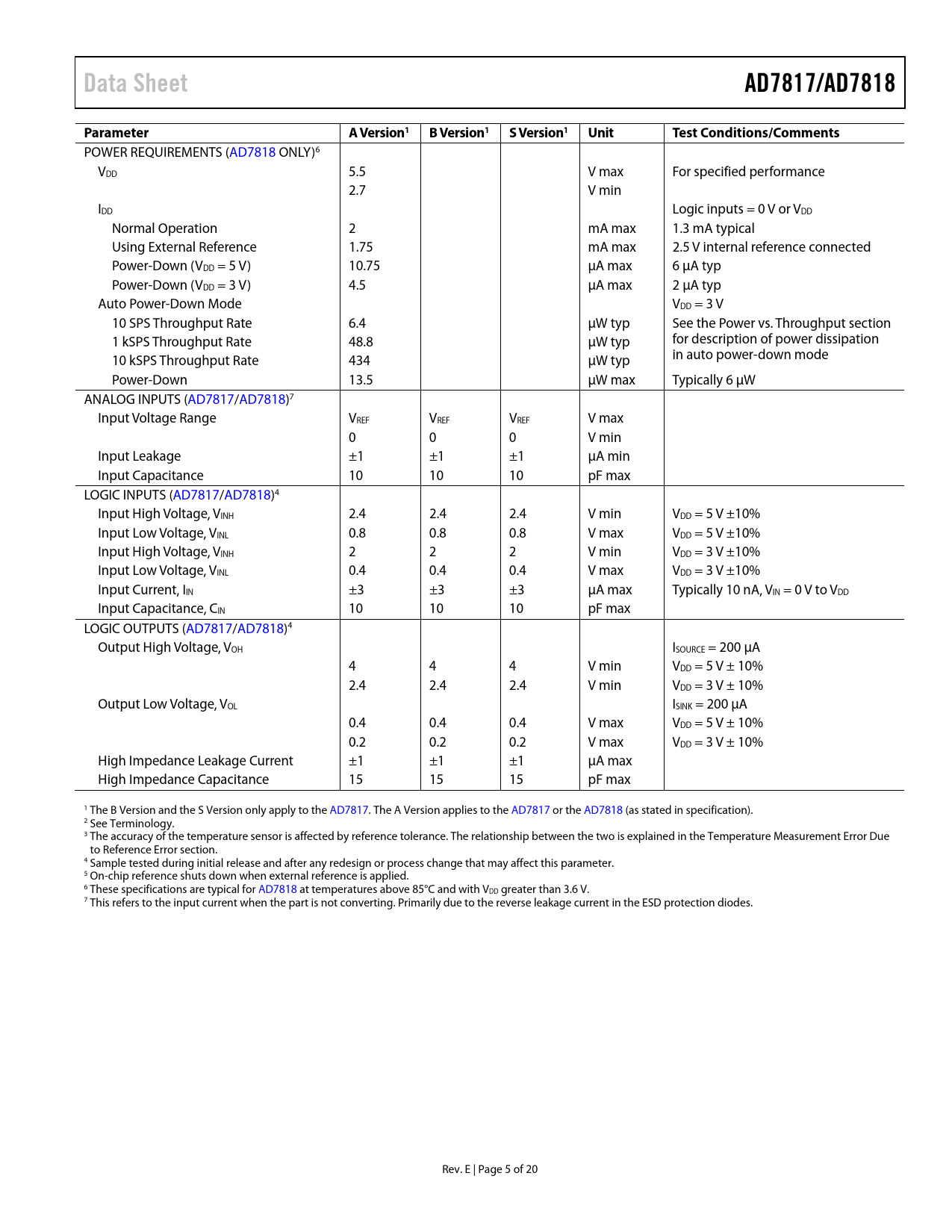 Pages / Page20 / 5 — Data Sheet. AD7817/AD7818. Parameter A. Version1 B. Version1 S. Version1 …