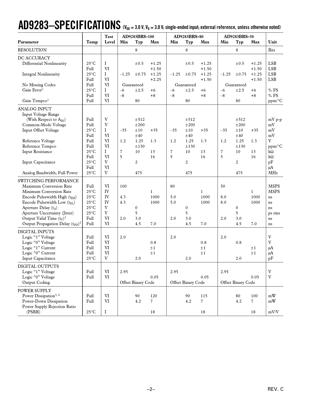 AD9283–SPECIFICATIONS (VDD = 3.0 V, VD = 3.0 V; single-ended input; external reference, unless otherwise noted)TestAD9283BRS-100AD9283BRS-80AD9283BRS-50ParameterTempLevelMinTypMaxMinTypMaxMinTypMaxUnit RESOLUTION 8 8 8 Bits DC ACCURACY Differential Nonlinearity 25°C I ±0.5 +1.25 ±0.5 +1.25 ±0.5 +1.25 LSB Full VI +1.50 +1.50 +1.50 LSB Integral Nonlinearity 25°C I –1.25 ±0.75 +1.25 –1.25 ±0.75 +1.25 –1.25 ±0.75 +1.25 LSB Full VI +2.25 +1.50 +1.50 LSB No Missing Codes Full VI Guaranteed Guaranteed Guaranteed Gain Error1 25°C I –6 ±2.5 +6 –6 ±2.5 +6 –6 ±2.5 +6 % FS Full VI –8 +8 –8 +8 –8 +8 % FS Gain Tempco1 Full VI 80 80 80 ppm/°C ANALOG INPUT Input Voltage Range (With Respect to AIN) Full V ±512 ±512 ±512 mV p-p Common-Mode Voltage Full V ±200 ±200 ±200 mV Input Offset Voltage 25°C I –35 ±10 +35 –35 ±10 +35 –35 ±10 +35 mV Full VI ±40 ±40 ±40 mV Reference Voltage Full VI 1.2 1.25 1.3 1.2 1.25 1.3 1.2 1.25 1.3 V Reference Tempco Full VI ±130 ±130 ±130 ppm/°C Input Resistance 25°C I 7 10 13 7 10 13 7 10 13 kΩ Full VI 5 16 5 16 5 16 kΩ Input Capacitance 25°C V 2 2 2 pF Full VI µA Analog Bandwidth, Full Power 25°C V 475 475 475 MHz SWITCHING PERFORMANCE Maximum Conversion Rate Full VI 100 80 50 MSPS Minimum Conversion Rate 25°C IV 1 1 1 MSPS Encode Pulsewidth High (tEH) 25°C IV 4.3 1000 5.0 1000 8.0 1000 ns Encode Pulsewidth Low (tEL) 25°C IV 4.3 1000 5.0 1000 8.0 1000 ns Aperture Delay (tA) 25°C V 0 0 0 ns Aperture Uncertainty (Jitter) 25°C V 5 5 5 ps rms Output Valid Time (tV)2 Full VI 2.0 3.0 2.0 3.0 2.0 3.0 ns Output Propagation Delay (tPD)2 Full VI 4.5 7.0 4.5 7.0 4.5 7.0 ns DIGITAL INPUTS Logic “1” Voltage Full VI 2.0 2.0 2.0 V Logic “0” Voltage Full VI 0.8 0.8 0.8 V Logic “1” Current Full VI ±1 ±1 ±1 µA Logic “0” Current Full VI ±1 ±1 ±1 µA Input Capacitance 25°C V 2.0 2.0 2.0 pF DIGITAL OUTPUTS Logic “1” Voltage Full VI 2.95 2.95 2.95 V Logic “0” Voltage Full VI 0.05 0.05 0.05 V Output Coding Offset Binary Code Offset Binary Code Offset Binary Code POWER SUPPLY Power Dissipation3, 4 Full VI 90 120 90 115 80 100 mW Power-Down Dissipation Full VI 4.2 7 4.2 7 4.2 7 mW Power Supply Rejection Ratio (PSRR) 25°C I 18 18 18 mV/V –2– REV. C