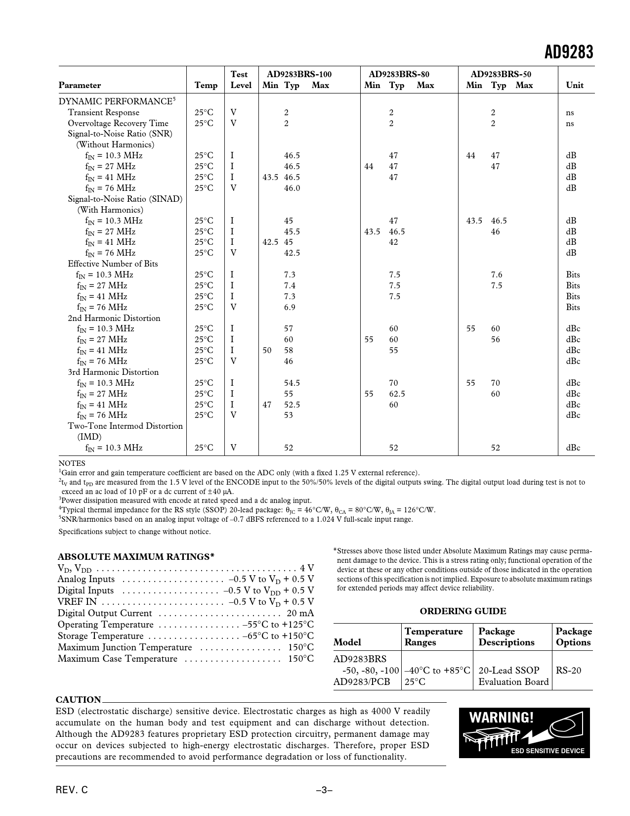 AD9283TestAD9283BRS-100AD9283BRS-80AD9283BRS-50ParameterTempLevelMin TypMaxMinTypMaxMinTypMaxUnit DYNAMIC PERFORMANCE5 Transient Response 25°C V 2 2 2 ns Overvoltage Recovery Time 25°C V 2 2 2 ns Signal-to-Noise Ratio (SNR) (Without Harmonics) fIN = 10.3 MHz 25°C I 46.5 47 44 47 dB fIN = 27 MHz 25°C I 46.5 44 47 47 dB fIN = 41 MHz 25°C I 43.5 46.5 47 dB fIN = 76 MHz 25°C V 46.0 dB Signal-to-Noise Ratio (SINAD) (With Harmonics) fIN = 10.3 MHz 25°C I 45 47 43.5 46.5 dB fIN = 27 MHz 25°C I 45.5 43.5 46.5 46 dB fIN = 41 MHz 25°C I 42.5 45 42 dB fIN = 76 MHz 25°C V 42.5 dB Effective Number of Bits fIN = 10.3 MHz 25°C I 7.3 7.5 7.6 Bits fIN = 27 MHz 25°C I 7.4 7.5 7.5 Bits fIN = 41 MHz 25°C I 7.3 7.5 Bits fIN = 76 MHz 25°C V 6.9 Bits 2nd Harmonic Distortion fIN = 10.3 MHz 25°C I 57 60 55 60 dBc fIN = 27 MHz 25°C I 60 55 60 56 dBc fIN = 41 MHz 25°C I 50 58 55 dBc fIN = 76 MHz 25°C V 46 dBc 3rd Harmonic Distortion fIN = 10.3 MHz 25°C I 54.5 70 55 70 dBc fIN = 27 MHz 25°C I 55 55 62.5 60 dBc fIN = 41 MHz 25°C I 47 52.5 60 dBc fIN = 76 MHz 25°C V 53 dBc Two-Tone Intermod Distortion (IMD) fIN = 10.3 MHz 25°C V 52 52 52 dBc NOTES 1Gain error and gain temperature coefficient are based on the ADC only (with a fixed 1.25 V external reference). 2tV and tPD are measured from the 1.5 V level of the ENCODE input to the 50%/50% levels of the digital outputs swing. The digital output load during test is not to exceed an ac load of 10 pF or a dc current of ± 40 µA. 3Power dissipation measured with encode at rated speed and a dc analog input. 4Typical thermal impedance for the RS style (SSOP) 20-lead package: θJC = 46°C/W, θCA = 80°C/W, θJA = 126°C/W. 5SNR/harmonics based on an analog input voltage of –0.7 dBFS referenced to a 1.024 V full-scale input range. Specifications subject to change without notice. *Stresses above those listed under Absolute Maximum Ratings may cause perma- ABSOLUTE MAXIMUM RATINGS* nent damage to the device. This is a stress rating only; functional operation of the VD, VDD . 4 V device at these or any other conditions outside of those indicated in the operation Analog Inputs . –0.5 V to VD + 0.5 V sections of this specification is not implied. Exposure to absolute maximum ratings Digital Inputs . –0.5 V to V for extended periods may affect device reliability. DD + 0.5 V VREF IN . –0.5 V to VD + 0.5 V Digital Output Current . 20 mA ORDERING GUIDE Operating Temperature . –55°C to +125°C TemperaturePackagePackage Storage Temperature . –65°C to +150°C ModelRangesDescriptionsOptions Maximum Junction Temperature . 150°C Maximum Case Temperature . 150°C AD9283BRS -50, -80, -100 –40°C to +85°C 20-Lead SSOP RS-20 AD9283/PCB 25°C Evaluation Board CAUTION ESD (electrostatic discharge) sensitive device. Electrostatic charges as high as 4000 V readily WARNING! accumulate on the human body and test equipment and can discharge without detection. Although the AD9283 features proprietary ESD protection circuitry, permanent damage may occur on devices subjected to high-energy electrostatic discharges. Therefore, proper ESD ESD SENSITIVE DEVICE precautions are recommended to avoid performance degradation or loss of functionality. REV. C –3–