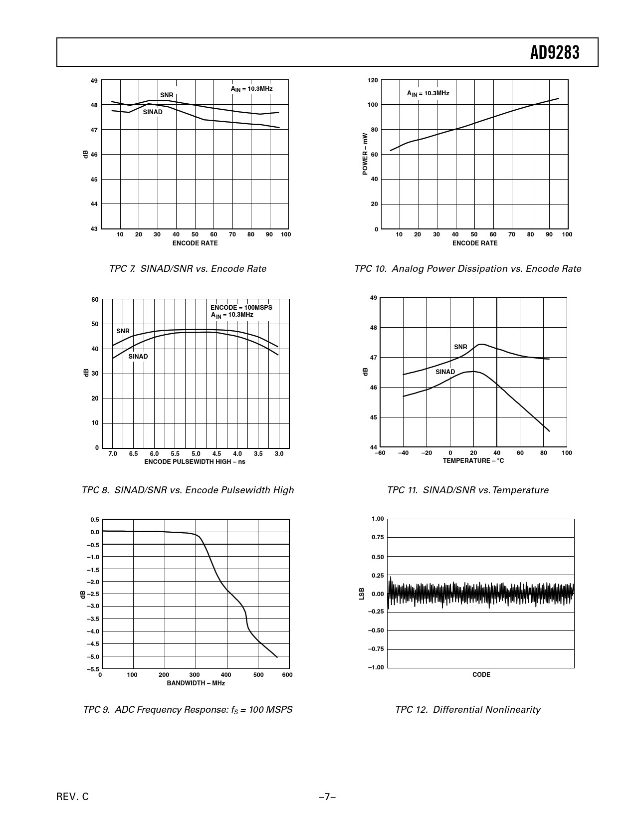 AD9283. 120. AIN = 10.3MHz. SNR. 100. SINAD. mW –. dB 46. POWER. ENCODE RATE. ENCODE = 100MSPS AIN = 10.3MHz. dB 30. 7.0. 6.5. 6.0. 5.5. 5.0. 4.5. 4.0. 3.5