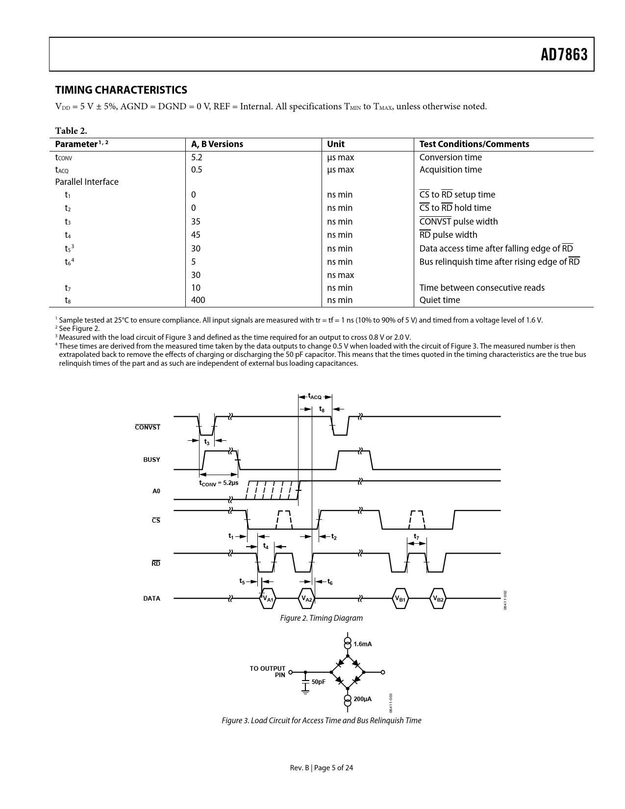 link to page 25 link to page 25 link to page 25 link to page 25 link to page 6 link to page 6 link to page 6 link to page 6 link to page 6 link to page 6 AD7863TIMING CHARACTERISTICS VDD = 5 V ± 5%, AGND = DGND = 0 V, REF = Internal. All specifications TMIN to TMAX, unless otherwise noted. Table 2. Parameter1,2A, B VersionsUnitTest Conditions/Comments tCONV 5.2 μs max Conversion time tACQ 0.5 μs max Acquisition time Parallel Interface t1 0 ns min CS to RD setup time t2 0 ns min CS to RD hold time t3 35 ns min CONVST pulse width t4 45 ns min RD pulse width t 3 5 30 ns min Data access time after falling edge of RD t 4 6 5 ns min Bus relinquish time after rising edge of RD 30 ns max t7 10 ns min Time between consecutive reads t8 400 ns min Quiet time 1 Sample tested at 25°C to ensure compliance. All input signals are measured with tr = tf = 1 ns (10% to 90% of 5 V) and timed from a voltage level of 1.6 V. 2 See Figure 2. 3 Measured with the load circuit of Figure 3 and defined as the time required for an output to cross 0.8 V or 2.0 V. 4 These times are derived from the measured time taken by the data outputs to change 0.5 V when loaded with the circuit of Figure 3. The measured number is then extrapolated back to remove the effects of charging or discharging the 50 pF capacitor. This means that the times quoted in the timing characteristics are the true bus relinquish times of the part and as such are independent of external bus loading capacitances. tACQt8CONVSTt3BUSYtCONV = 5.2µsA0CSt1t2t7t4RDt5t6 02 DATAV 0 A1VA2VB1VB2 1- 41 06 Figure 2. Timing Diagram 1.6mATO OUTPUTPIN50pF200µA 03 0 1- 41 06 Figure 3. Load Circuit for Access Time and Bus Relinquish Time Rev. B | Page 5 of 24 Document Outline FEATURES GENERAL DESCRIPTION PRODUCT HIGHLIGHTS TABLE OF CONTENTS REVISION HISTORY SPECIFICATIONS TIMING CHARACTERISTICS ABSOLUTE MAXIMUM RATINGS ESD CAUTION PIN CONFIGURATION AND FUNCTION DESCRIPTIONS TERMINOLOGY CONVERTER DETAILS TRACK-AND-HOLD SECTION REFERENCE SECTION CIRCUIT DESCRIPTION ANALOG INPUT SECTION OFFSET AND FULL-SCALE ADJUSTMENT Positive Full-Scale Adjust (−10 Version) Negative Full-Scale Adjust (−10 Version) TIMING AND CONTROL Read Options OPERATING MODES MODE 1 OPERATION Normal Power, High Sampling Performance MODE 2 OPERATION Power-Down, Auto-Sleep After Conversion AD7863 DYNAMIC SPECIFICATIONS SIGNAL-TO-NOISE RATIO (SNR) EFFECTIVE NUMBER OF BITS TOTAL HARMONIC DISTORTION (THD) INTERMODULATION DISTORTION PEAK HARMONIC OR SPURIOUS NOISE DC LINEARITY PLOT POWER CONSIDERATIONS MICROPROCESSOR INTERFACING AD7863 TO ADSP-2100 INTERFACE AD7863 TO ADSP-2101/ADSP-2102 INTERFACE AD7863 TO TMS32010 INTERFACE AD7863 TO TMS320C25 INTERFACE AD7863 TO MC68000 INTERFACE AD7863 TO 80C196 INTERFACE VECTOR MOTOR CONTROL MULTIPLE AD7863S APPLICATIONS HINTS PC BOARD LAYOUT CONSIDERATIONS GROUND PLANES POWER PLANES SUPPLY DECOUPLING OUTLINE DIMENSIONS ORDERING GUIDE