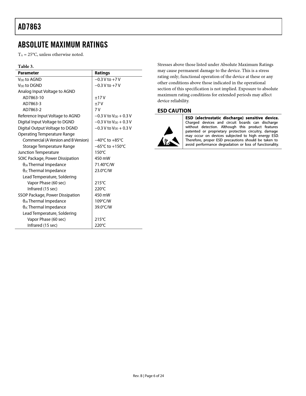 Pages / Page25 / 7 — AD7863. ABSOLUTE MAXIMUM RATINGS. Table 3. Parameter Ratings. ESD CAUTION