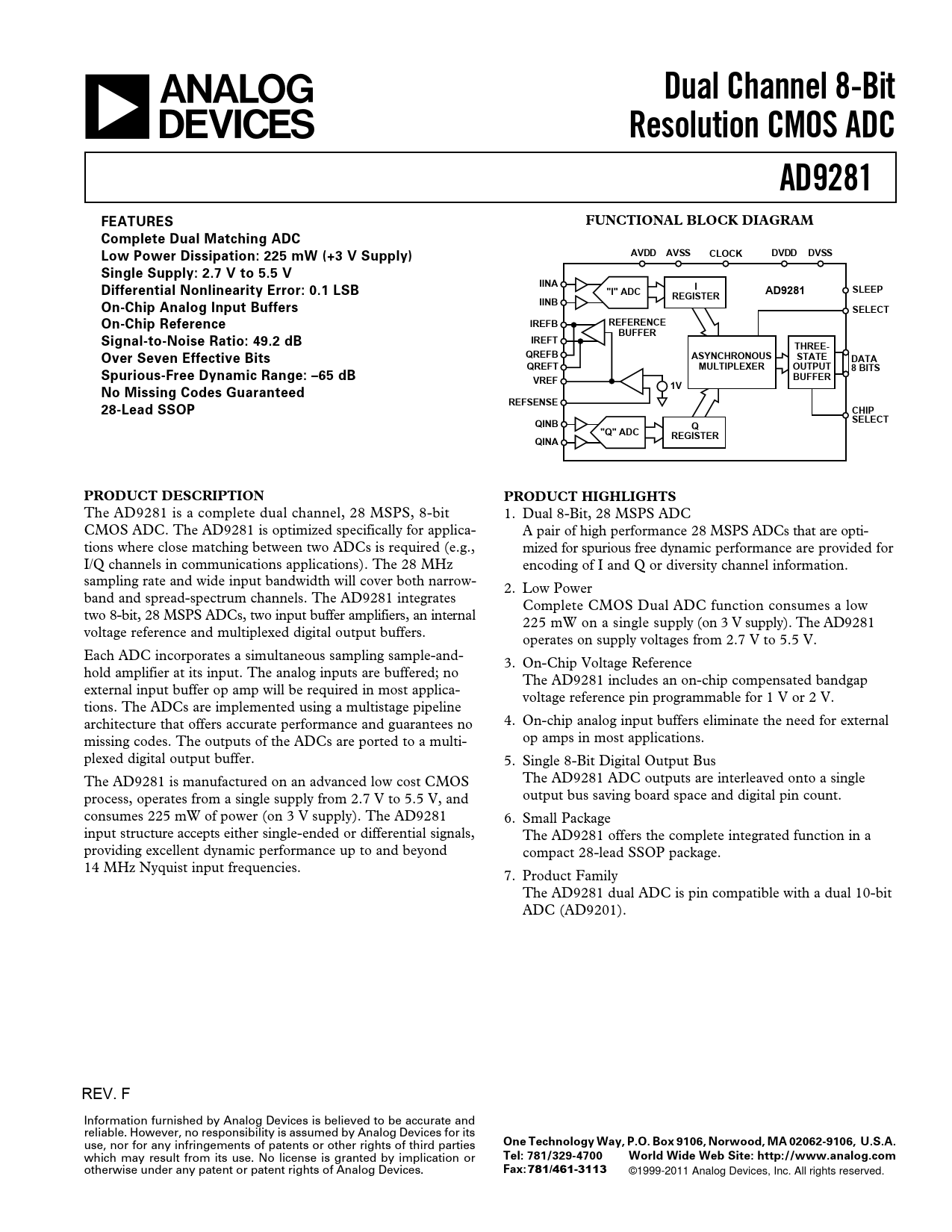 | Pages / Page | 16 / 1 — Dual Channel 8-Bit. Resolution CMOS ADC. AD9281. FEATURES. FUNCTIONAL … |
