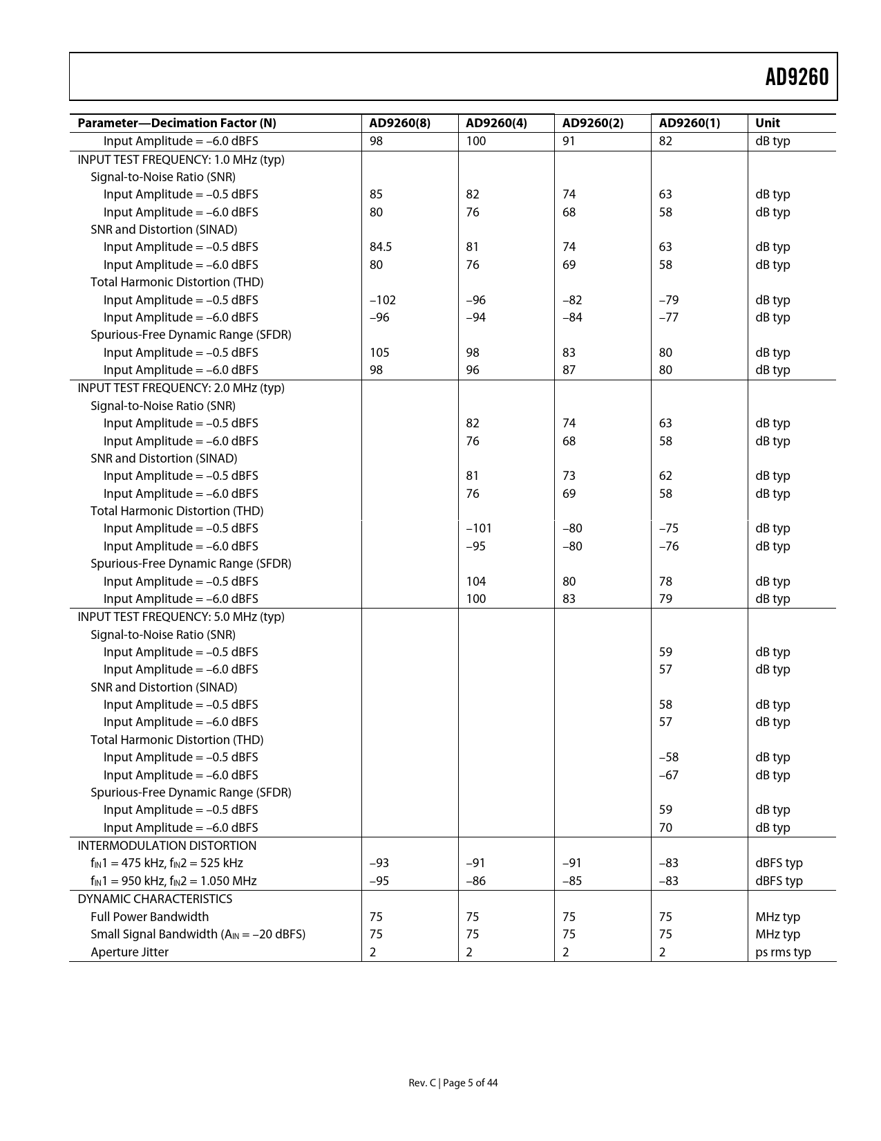 AD9260 Parameter—Decimation Factor (N) AD9260(8) AD9260(4) AD9260(2) AD9260(1) Unit