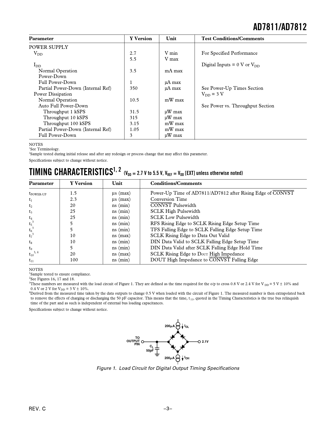 link to page 12 link to page 12 link to page 3 link to page 3 link to page 4 link to page 4 link to page 3 link to page 15 link to page 15 link to page 16 link to page 3 link to page 3 link to page 3 link to page 3 link to page 3 AD7811/AD7812ParameterY VersionUnitTest Conditions/Comments POWER SUPPLY VDD 2.7 V min For Specified Performance 5.5 V max IDD Digital Inputs = 0 V or VDD Normal Operation 3.5 mA max Power-Down Full Power-Down 1 µA max Partial Power-Down (Internal Ref) 350 µA max See Power-Up Times Section Power Dissipation VDD = 3 V Normal Operation 10.5 mW max Auto Full Power-Down See Power vs. Throughput Section Throughput 1 kSPS 31.5 µW max Throughput 10 kSPS 315 µW max Throughput 100 kSPS 3.15 mW max Partial Power-Down (Internal Ref) 1.05 mW max Full Power-Down 3 µW max NOTES 1See Terminology. 2Sample tested during initial release and after any redesign or process change that may affect this parameter. Specifications subject to change without notice. TIMING CHARACTERISTICS1, 2(VDD = 2.7 V to 5.5 V, VREF = VDD [EXT] unless otherwise noted)ParameterY VersionUnitConditions/Comments t 1.5 µs (max) Power-Up Time of AD7811/AD7812 after Rising Edge of CONVST POWER-UP t 2.3 µs (max) Conversion Time 1 t 20 ns (min) CONVST Pulsewidth 2 t 25 ns (min) SCLK High Pulsewidth 3 t 25 ns (min) SCLK Low Pulsewidth 4 t 3 5 ns (min) RFS Rising Edge to SCLK Rising Edge Setup Time 5 t 3 5 ns (min) TFS Falling Edge to SCLK Falling Edge Setup Time 6 t 3 10 ns (max) SCLK Rising Edge to Data Out Valid 7 t 10 ns (min) DIN Data Valid to SCLK Falling Edge Setup Time 8 t 5 ns (min) DIN Data Valid after SCLK Falling Edge Hold Time 9 t 3, 4 20 ns (max) SCLK Rising Edge to D 10 OUT High Impedance t 100 ns (min) DOUT High Impedance to CONVST Falling Edge 11 NOTES 1Sample tested to ensure compliance. 2See Figures 16, 17 and 18. 3These numbers are measured with the load circuit of Figure 1. They are defined as the time required for the o/p to cross 0.8 V or 2.4 V for V DD = 5 V ± 10% and 0.4 V or 2 V for VDD = 3 V ± 10%. 4Derived from the measured time taken by the data outputs to change 0.5 V when loaded with the circuit of Figure 1. The measured number is then extrapolated back to remove the effects of charging or discharging the 50 pF capacitor. This means that the time, t 11, quoted in the Timing Characteristics is the true bus relinquish time of the part and as such is independent of external bus loading capacitances. Specifications subject to change without notice. 200 AIOLTOOUTPUT2.1VPINCL50pFI200 AOH Figure 1. Load Circuit for Digital Output Timing Specifications REV. C –3– Document Outline Features General Description Product Highlights Functional Block Diagram Specifications Timing Characteristics Absolute Maximum Ratings ESD Caution Pin Configurations Pin Function Descriptions Terminology Signal to (Noise + Distortion) Ratio Total Harmonic Distortion Peak Harmonic or Spurious Noise Intermodulation Distortion Channel-to-Channel Isolation Relative Accuracy Differential Nonlinearity Offset Error Offset Error Match Gain Error Gain Error Match Track/Hold Acquisition Time Control Register (AD7811) Control Register (AD7812) Circuit Description Converter Operation Typical Connection Diagram Analog Input DC Acquisition Time AC Acquisition Time On-Chip Reference ADC Transfer Function Power-Down Options Power-On-Reset Power-Up Times Mode 2 Full Power-Down (PD1 = 1, PD0 = 0) Mode 2 Partial Power-Down (PD1 = 0, PD0 = 1) Power vs. Throughput Operating Modes Mode 1 Operation (High Speed Sampling) Mode 2 Operation (Automatic Power-Down) Serial Interface Simplifying the Serial Interface Microprocessor Interfacing AD7811/AD7812 to PIC16C6x/7x AD7811/AD7812 to MC68HC11 AD7811/AD7812 to 8051