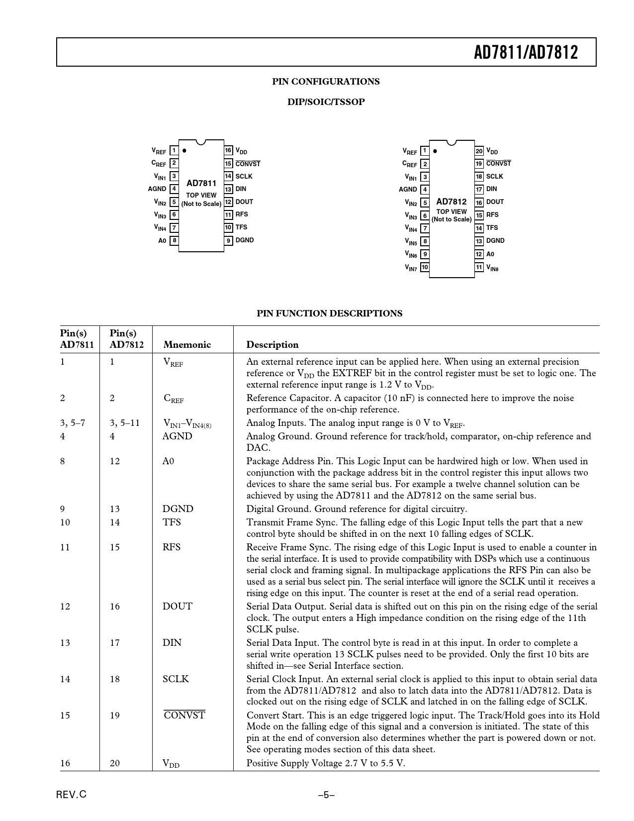 AD7811/AD7812PIN CONFIGURATIONSDIP/SOIC/TSSOPV116REFVDDV120 VREFDDC2REF15 CONVSTC219REFCONVSTV314 SCLKIN1V318 SCLKIN1AD7811AGND413 DINAGND417 DINTOP VIEWV512IN2(Not to Scale)DOUTVIN2 5AD781216 DOUTV6TOP VIEW11 RFSIN3V615 RFSIN3(Not to Scale)VIN4 710 TFSVIN4 714 TFSA089 DGNDV813IN5DGNDV9IN612 A0V1011IN7VIN8PIN FUNCTION DESCRIPTIONSPin(s)Pin(s)AD7811AD7812MnemonicDescription 1 1 VREF An external reference input can be applied here. When using an external precision reference or VDD the EXTREF bit in the control register must be set to logic one. The external reference input range is 1.2 V to VDD. 2 2 CREF Reference Capacitor. A capacitor (10 nF) is connected here to improve the noise performance of the on-chip reference. 3, 5–7 3, 5–11 VIN1–VIN4(8) Analog Inputs. The analog input range is 0 V to VREF. 4 4 AGND Analog Ground. Ground reference for track/hold, comparator, on-chip reference and DAC. 8 12 A0 Package Address Pin. This Logic Input can be hardwired high or low. When used in conjunction with the package address bit in the control register this input allows two devices to share the same serial bus. For example a twelve channel solution can be achieved by using the AD7811 and the AD7812 on the same serial bus. 9 13 DGND Digital Ground. Ground reference for digital circuitry. 10 14 TFS Transmit Frame Sync. The falling edge of this Logic Input tells the part that a new control byte should be shifted in on the next 10 falling edges of SCLK. 11 15 RFS Receive Frame Sync. The rising edge of this Logic Input is used to enable a counter in the serial interface. It is used to provide compatibility with DSPs which use a continuous serial clock and framing signal. In multipackage applications the RFS Pin can also be used as a serial bus select pin. The serial interface will ignore the SCLK until it receives a rising edge on this input. The counter is reset at the end of a serial read operation. 12 16 DOUT Serial Data Output. Serial data is shifted out on this pin on the rising edge of the serial clock. The output enters a High impedance condition on the rising edge of the 11th SCLK pulse. 13 17 DIN Serial Data Input. The control byte is read in at this input. In order to complete a serial write operation 13 SCLK pulses need to be provided. Only the first 10 bits are shifted in—see Serial Interface section. 14 18 SCLK Serial Clock Input. An external serial clock is applied to this input to obtain serial data from the AD7811/AD7812 and also to latch data into the AD7811/AD7812. Data is clocked out on the rising edge of SCLK and latched in on the falling edge of SCLK. 15 19 CONVST Convert Start. This is an edge triggered logic input. The Track/Hold goes into its Hold Mode on the falling edge of this signal and a conversion is initiated. The state of this pin at the end of conversion also determines whether the part is powered down or not. See operating modes section of this data sheet. 16 20 VDD Positive Supply Voltage 2.7 V to 5.5 V. REV. B C –5– Document Outline Features General Description Product Highlights Functional Block Diagram Specifications Timing Characteristics Absolute Maximum Ratings ESD Caution Pin Configurations Pin Function Descriptions Terminology Signal to (Noise + Distortion) Ratio Total Harmonic Distortion Peak Harmonic or Spurious Noise Intermodulation Distortion Channel-to-Channel Isolation Relative Accuracy Differential Nonlinearity Offset Error Offset Error Match Gain Error Gain Error Match Track/Hold Acquisition Time Control Register (AD7811) Control Register (AD7812) Circuit Description Converter Operation Typical Connection Diagram Analog Input DC Acquisition Time AC Acquisition Time On-Chip Reference ADC Transfer Function Power-Down Options Power-On-Reset Power-Up Times Mode 2 Full Power-Down (PD1 = 1, PD0 = 0) Mode 2 Partial Power-Down (PD1 = 0, PD0 = 1) Power vs. Throughput Operating Modes Mode 1 Operation (High Speed Sampling) Mode 2 Operation (Automatic Power-Down) Serial Interface Simplifying the Serial Interface Microprocessor Interfacing AD7811/AD7812 to PIC16C6x/7x AD7811/AD7812 to MC68HC11 AD7811/AD7812 to 8051