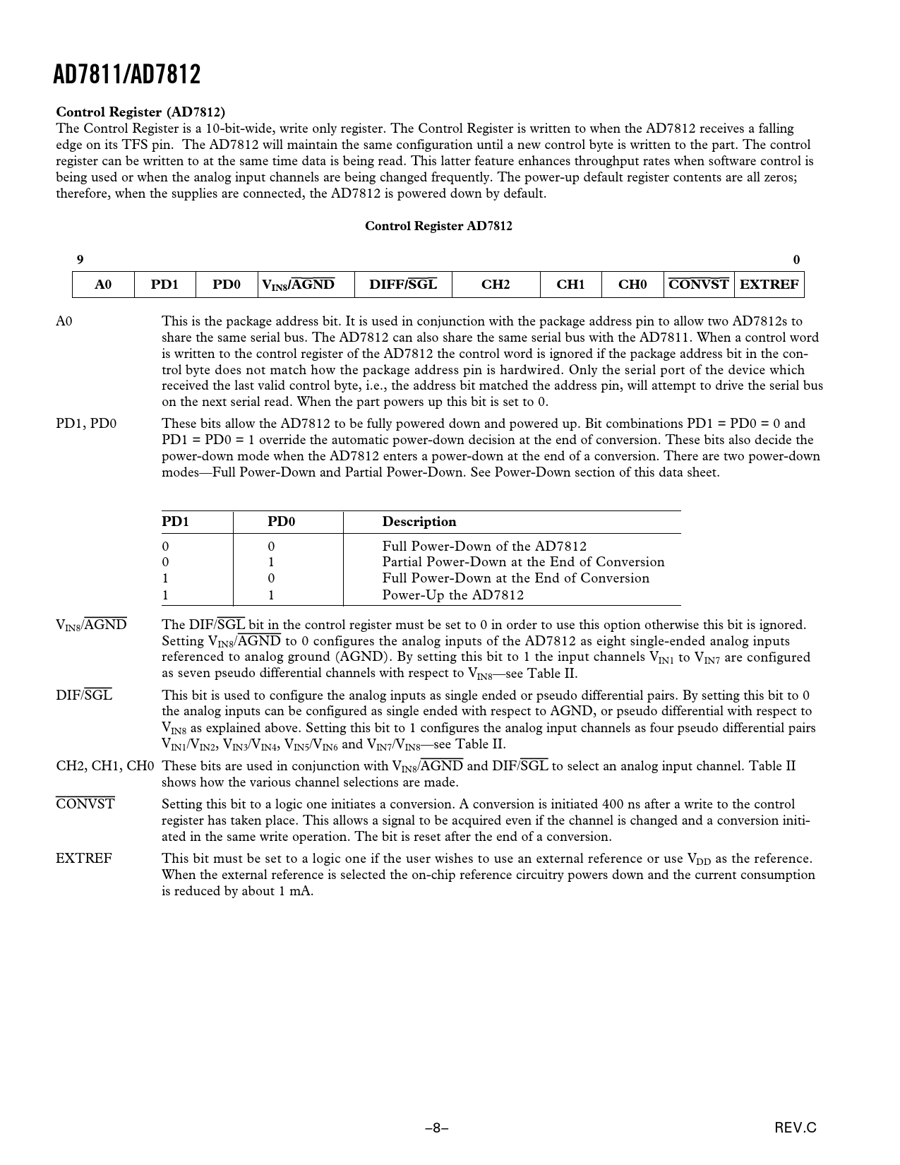 A0 This is the package address bit. It is used in conjunction with the package address pin to allow two AD7812s to share the same serial bus. The AD7812 can also share the same serial bus with the AD7811. When a control word is written to the control register of the AD7812 the control word is ignored if the package address bit in the con- trol byte does not match how the package address pin is hardwired. Only the serial port of the device which received the last valid control byte, i.e., the address bit matched the address pin, will attempt to drive the serial bus on the next serial read. When the part powers up this bit is set to 0. PD1, PD0 These bits allow the AD7812 to be fully powered down and powered up. Bit combinations PD1 = PD0 = 0 and PD1 = PD0 = 1 override the automatic power-down decision at the end of conversion. These bits also decide the power-down mode when the AD7812 enters a power-down at the end of a conversion. There are two power-down modes—Full Power-Down and Partial Power-Down. See Power-Down section of this data sheet.