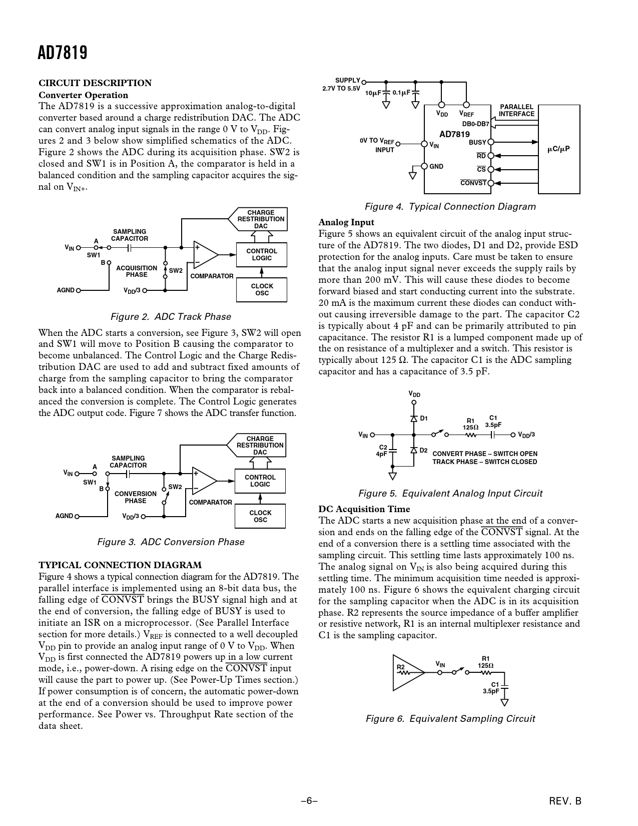 AD7819CIRCUIT DESCRIPTIONSUPPLY2.7V TO 5.5VConverter Operation10F0.1F The AD7819 is a successive approximation analog-to-digital PARALLELV converter based around a charge redistribution DAC. The ADC DDVREFINTERFACEDB0-DB7 can convert analog input signals in the range 0 V to VDD. Fig- AD7819 ures 2 and 3 below show simplified schematics of the ADC. 0V TO VREFBUSYVIN Figure 2 shows the ADC during its acquisition phase. SW2 is INPUTC/PRD closed and SW1 is in Position A, the comparator is held in a GNDCS balanced condition and the sampling capacitor acquires the sig- nal on V CONVST IN+. Figure 4. Typical Connection Diagram CHARGERESTRIBUTIONAnalog InputDACSAMPLING Figure 5 shows an equivalent circuit of the analog input struc- CAPACITORAV ture of the AD7819. The two diodes, D1 and D2, provide ESD INCONTROLSW1LOGIC protection for the analog inputs. Care must be taken to ensure BACQUISITIONSW2 that the analog input signal never exceeds the supply rails by PHASECOMPARATOR more than 200 mV. This will cause these diodes to become CLOCKAGNDVDD/3OSC forward biased and start conducting current into the substrate. 20 mA is the maximum current these diodes can conduct with- Figure 2. ADC Track Phase out causing irreversible damage to the part. The capacitor C2 is typically about 4 pF and can be primarily attributed to pin When the ADC starts a conversion, see Figure 3, SW2 will open capacitance. The resistor R1 is a lumped component made up of and SW1 will move to Position B causing the comparator to the on resistance of a multiplexer and a switch. This resistor is become unbalanced. The Control Logic and the Charge Redis- typically about 125 Ω. The capacitor C1 is the ADC sampling tribution DAC are used to add and subtract fixed amounts of capacitor and has a capacitance of 3.5 pF. charge from the sampling capacitor to bring the comparator back into a balanced condition. When the comparator is rebal- VDD anced the conversion is complete. The Control Logic generates the ADC output code. Figure 7 shows the ADC transfer function. D1R1C11253.5pFVVCHARGEINDD/3RESTRIBUTIONC2DACD24pFCONVERT PHASE – SWITCH OPENSAMPLINGTRACK PHASE – SWITCH CLOSEDCAPACITORAVINCONTROLSW1LOGICSW2BCONVERSION Figure 5. Equivalent Analog Input Circuit PHASECOMPARATORDC Acquisition TimeCLOCKAGNDVDD/3OSC The ADC starts a new acquisition phase at the end of a conver- sion and ends on the falling edge of the CONVST signal. At the Figure 3. ADC Conversion Phase end of a conversion there is a settling time associated with the sampling circuit. This settling time lasts approximately 100 ns. TYPICAL CONNECTION DIAGRAM The analog signal on VIN is also being acquired during this Figure 4 shows a typical connection diagram for the AD7819. The settling time. The minimum acquisition time needed is approxi- parallel interface is implemented using an 8-bit data bus, the mately 100 ns. Figure 6 shows the equivalent charging circuit falling edge of CONVST brings the BUSY signal high and at for the sampling capacitor when the ADC is in its acquisition the end of conversion, the falling edge of BUSY is used to phase. R2 represents the source impedance of a buffer amplifier initiate an ISR on a microprocessor. (See Parallel Interface or resistive network, R1 is an internal multiplexer resistance and section for more details.) VREF is connected to a well decoupled C1 is the sampling capacitor. VDD pin to provide an analog input range of 0 V to VDD. When VDD is first connected the AD7819 powers up in a low current R1V mode, i.e., power-down. A rising edge on the CONVST input IN125R2 will cause the part to power up. (See Power-Up Times section.) C1 If power consumption is of concern, the automatic power-down 3.5pF at the end of a conversion should be used to improve power performance. See Power vs. Throughput Rate section of the Figure 6. Equivalent Sampling Circuit data sheet. –6– REV. B