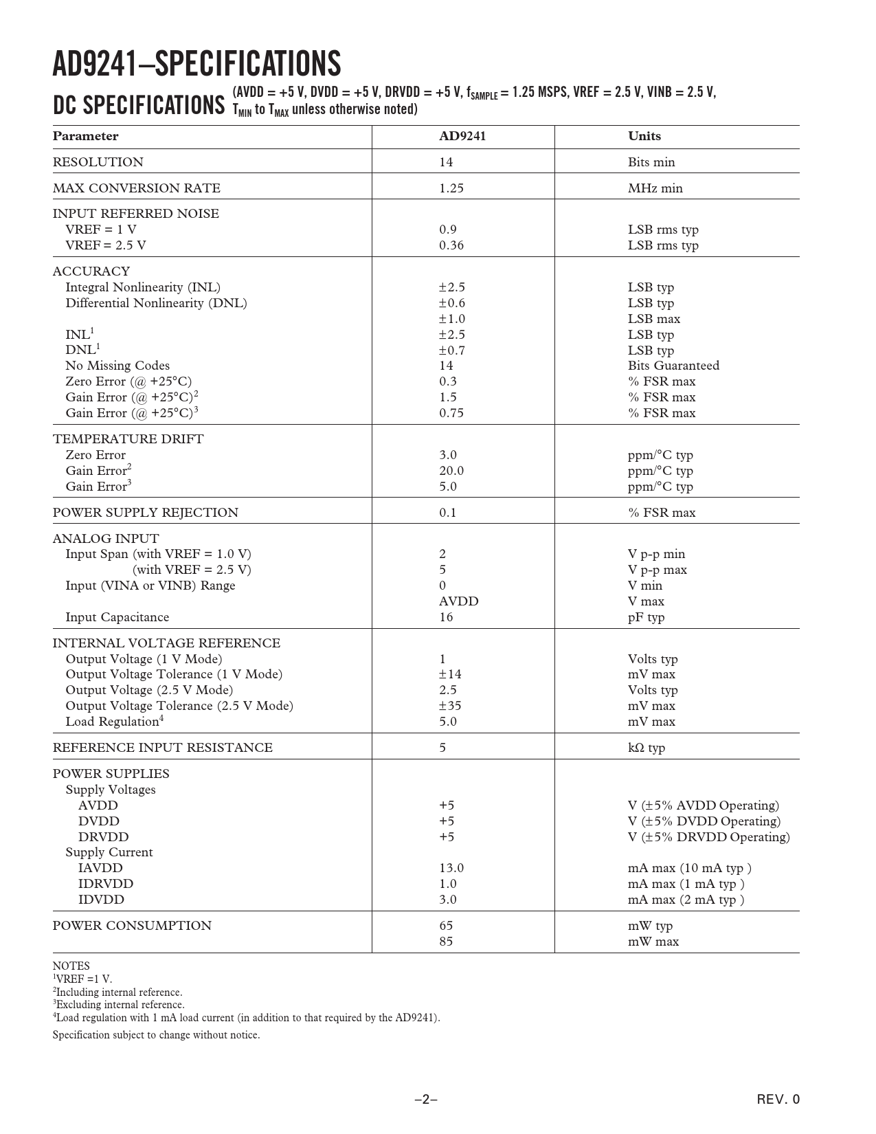 AD9241–SPECIFICATIONS (AVDD = +5 V, DVDD = +5 V, DRVDD = +5 V, f DC SPECIFICATIONS SAMPLE = 1.25 MSPS, VREF = 2.5 V, VINB = 2.5 V, TMIN to TMAX unless otherwise noted) Parameter AD9241 Units