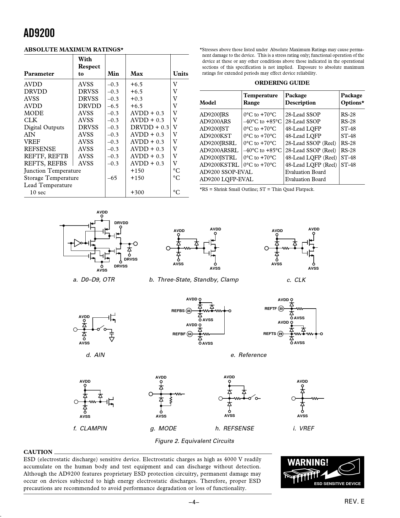 AD9200ABSOLUTE MAXIMUM RATINGS* *Stresses above those listed under Absolute Maximum Ratings may cause perma- nent damage to the device. This is a stress rating only; functional operation of the With device at these or any other conditions above those indicated in the operational Respect sections of this specification is not implied. Exposure to absolute maximum ParametertoMinMaxUnits ratings for extended periods may effect device reliability. AVDD AVSS –0.3 +6.5 V ORDERING GUIDE DRVDD DRVSS –0.3 +6.5 V TemperaturePackagePackage AVSS DRVSS –0.3 +0.3 V ModelRangeDescriptionOptions* AVDD DRVDD –6.5 +6.5 V MODE AVSS –0.3 AVDD + 0.3 V AD9200JRS 0°C to +70°C 28-Lead SSOP RS-28 CLK AVSS –0.3 AVDD + 0.3 V AD9200ARS –40°C to +85°C 28-Lead SSOP RS-28 Digital Outputs DRVSS –0.3 DRVDD + 0.3 V AD9200JST 0°C to +70°C 48-Lead LQFP ST-48 AIN AVSS –0.3 AVDD + 0.3 V AD9200KST 0°C to +70°C 48-Lead LQFP ST-48 VREF AVSS –0.3 AVDD + 0.3 V AD9200JRSRL 0°C to +70°C 28-Lead SSOP (Reel) RS-28 REFSENSE AVSS –0.3 AVDD + 0.3 V AD9200ARSRL –40°C to +85°C 28-Lead SSOP (Reel) RS-28 REFTF, REFTB AVSS –0.3 AVDD + 0.3 V AD9200JSTRL 0°C to +70°C 48-Lead LQFP (Reel) ST-48 REFTS, REFBS AVSS –0.3 AVDD + 0.3 V AD9200KSTRL 0°C to +70°C 48-Lead LQFP (Reel) ST-48 Junction Temperature +150 °C AD9200 SSOP-EVAL Evaluation Board Storage Temperature –65 +150 °C AD9200 LQFP-EVAL Evaluation Board Lead Temperature *RS = Shrink Small Outline; ST = Thin Quad Flatpack. 10 sec +300 °C AVDDDRVDDAVDDAVDDAVDDAVDDDRVSSAVSSAVSSDRVSSAVSSAVSSAVSS a. D0–D9, OTR b. Three-State, Standby, Clamp c. CLK AVDDAVDDREFTFREFBSAVDDAVSSAVSSAVDDAVDDREFBFREFTSAVSSAVSSAVSS d. AIN e. Reference AVDDAVDDAVDDAVDDAVSSAVSSAVSSAVSS f. CLAMPIN g. MODE h. REFSENSE i. VREF Figure 2. Equivalent Circuits CAUTION ESD (electrostatic discharge) sensitive device. Electrostatic charges as high as 4000 V readily WARNING! accumulate on the human body and test equipment and can discharge without detection. Although the AD9200 features proprietary ESD protection circuitry, permanent damage may occur on devices subjected to high energy electrostatic discharges. Therefore, proper ESD ESD SENSITIVE DEVICE precautions are recommended to avoid performance degradation or loss of functionality. –4– REV. E
