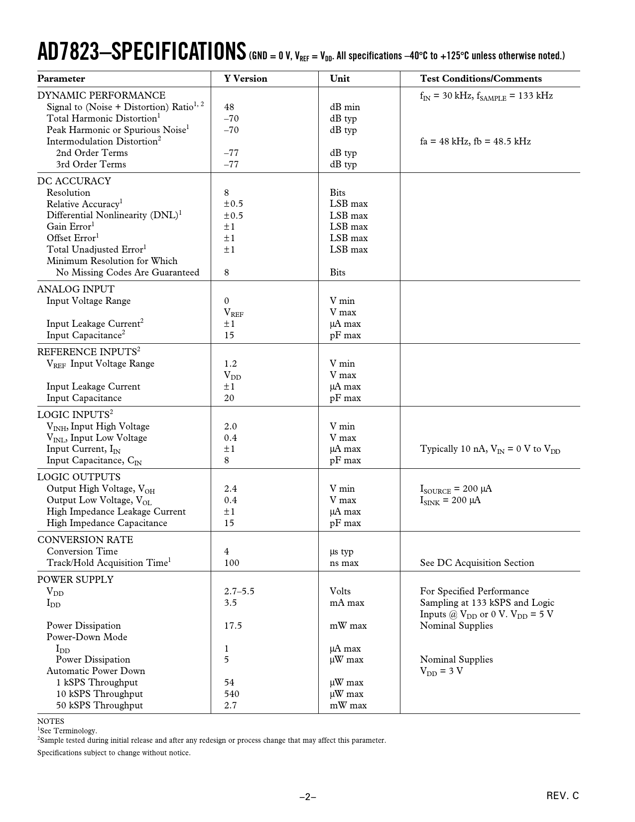AD7823–SPECIFICATIONS(GND = 0 V, VREF = VDD. All specifications –40