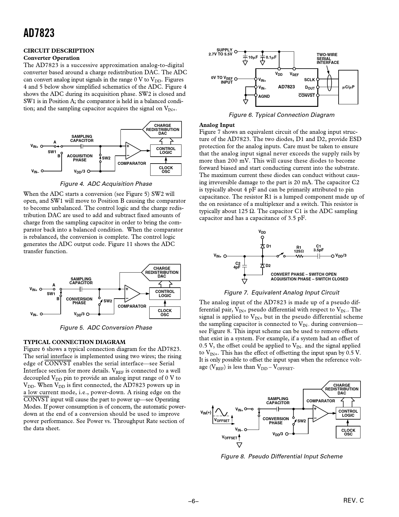 AD7823CIRCUIT DESCRIPTIONSUPPLY2.7V TO 5.5VTWO-WIREConverter Operation10 F0.1 FSERIAL The AD7823 is a successive approximation analog-to-digital INTERFACE converter based around a charge redistribution DAC. The ADC VVDDREF can convert analog input signals in the range 0 V to V 0V TO VREF DD. Figures VSCLKIN+INPUT 4 and 5 below show simplified schematics of the ADC. Figure 4 VAD7823D C/ PIN–OUT shows the ADC during its acquisition phase. SW2 is closed and AGNDCONVST SW1 is in Position A; the comparator is held in a balanced condi- tion; and the sampling capacitor acquires the signal on VIN+. Figure 6. Typical Connection Diagram CHARGEAnalog InputREDISTRIBUTIONDAC Figure 7 shows an equivalent circuit of the analog input struc- SAMPLINGCAPACITOR ture of the AD7823. The two diodes, D1 and D2, provide ESD AVIN+ protection for the analog inputs. Care must be taken to ensure CONTROLSW1LOGIC that the analog input signal never exceeds the supply rails by BACQUISITIONSW2PHASE more than 200 mV. This will cause these diodes to become COMPARATORCLOCK forward biased and start conducting current into the substrate. VIN–VDD/3OSC The maximum current these diodes can conduct without caus- Figure 4. ADC Acquisition Phase ing irreversible damage to the part is 20 mA. The capacitor C2 is typically about 4 pF and can be primarily attributed to pin When the ADC starts a conversion (see Figure 5) SW2 will capacitance. The resistor R1 is a lumped component made up of open, and SW1 will move to Position B causing the comparator the on resistance of a multiplexer and a switch. This resistor is to become unbalanced. The control logic and the charge redis- typically about 125 Ω. The capacitor C1 is the ADC sampling tribution DAC are used to add and subtract fixed amounts of capacitor and has a capacitance of 3.5 pF. charge from the sampling capacitor in order to bring the com- parator back into a balanced condition. When the comparator VDD is rebalanced, the conversion is complete. The control logic generates the ADC output code. Figure 11 shows the ADC D1C1R1 transfer function. 3.5pF125 ⍀ VIN+VDD/3C2D2CHARGE4pFREDISTRIBUTIONCONVERT PHASE – SWITCH OPENDACSAMPLINGACQUISITION PHASE – SWITCH CLOSEDCAPACITORAVIN+CONTROLSW1 Figure 7. Equivalent Analog Input Circuit LOGICBCONVERSIONSW2PHASE The analog input of the AD7823 is made up of a pseudo dif- COMPARATORCLOCK ferential pair, VIN+ pseudo differential with respect to VIN–. The VVIN–DD/3OSC signal is applied to VIN+ but in the pseudo differential scheme the sampling capacitor is connected to V Figure 5. ADC Conversion Phase IN– during conversion— see Figure 8. This input scheme can be used to remove offsets that exist in a system. For example, if a system had an offset of TYPICAL CONNECTION DIAGRAM 0.5 V, the offset could be applied to V Figure 6 shows a typical connection diagram for the AD7823. IN– and the signal applied to V The serial interface is implemented using two wires; the rising IN+. This has the effect of offsetting the input span by 0.5 V. It is only possible to offset the input span when the reference volt- edge of CONVST enables the serial interface—see Serial age (V Interface section for more details. V REF) is less than VDD – VOFFSET. REF is connected to a well decoupled VDD pin to provide an analog input range of 0 V to VDD. When VDD is first connected, the AD7823 powers up in CHARGEREDISTRIBUTION a low current mode, i.e., power-down. A rising edge on the DAC CONVST input will cause the part to power up—see Operating SAMPLINGCOMPARATORCAPACITOR Modes. If power consumption is of concern, the automatic power- VIN+ down at the end of a conversion should be used to improve CONTROLVIN(+)LOGIC power performance. See Power vs. Throughput Rate section of CONVERSIONVOFFSETSW2PHASE the data sheet. VIN–CLOCKVDD/3OSCVOFFSET Figure 8. Pseudo Differential Input Scheme –6– REV. C