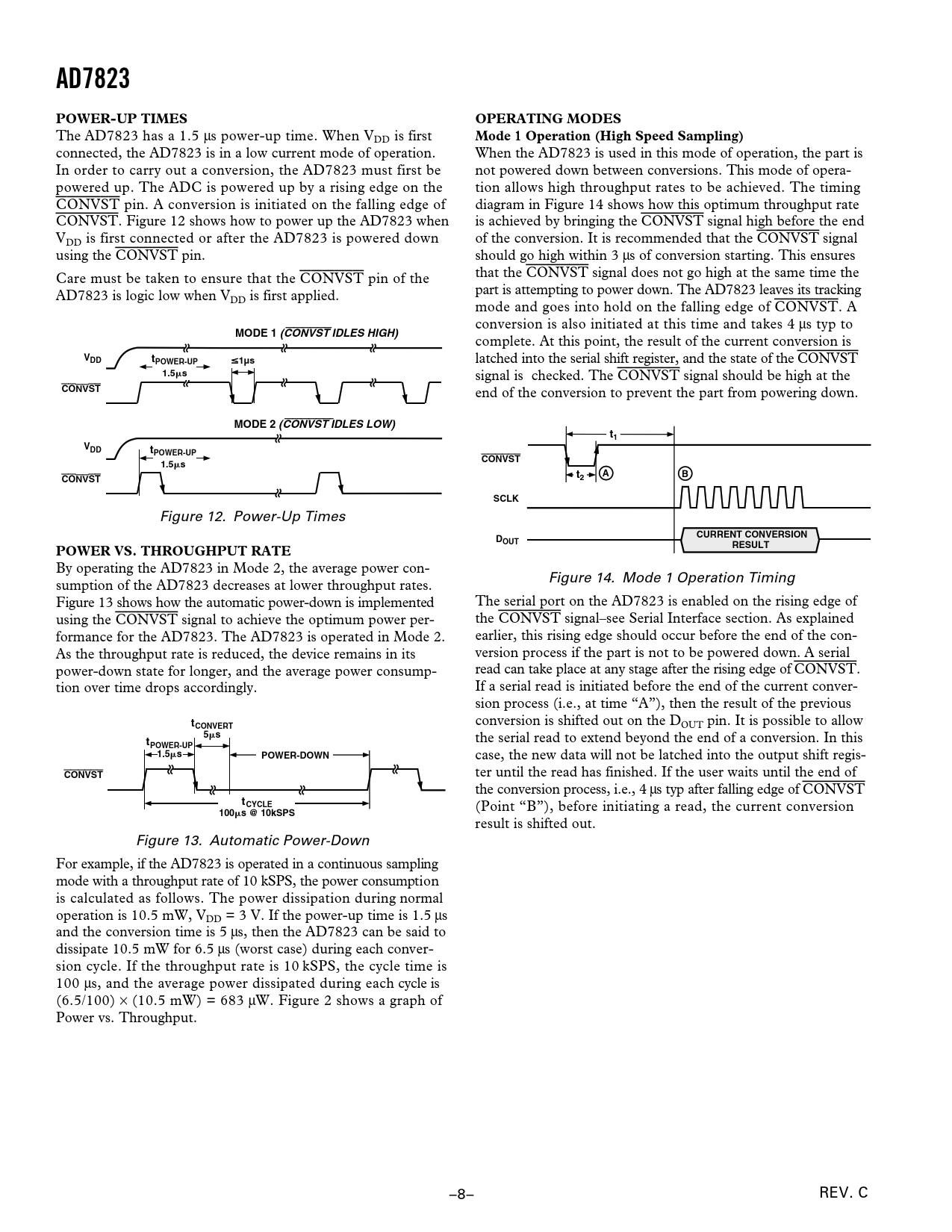 AD7823POWER-UP TIMESOPERATING MODES The AD7823 has a 1.5 µs power-up time. When VDD is first Mode 1 Operation (High Speed Sampling) connected, the AD7823 is in a low current mode of operation. When the AD7823 is used in this mode of operation, the part is In order to carry out a conversion, the AD7823 must first be not powered down between conversions. This mode of opera- powered up. The ADC is powered up by a rising edge on the tion allows high throughput rates to be achieved. The timing CONVST pin. A conversion is initiated on the falling edge of diagram in Figure 14 shows how this optimum throughput rate CONVST. Figure 12 shows how to power up the AD7823 when is achieved by bringing the CONVST signal high before the end VDD is first connected or after the AD7823 is powered down of the conversion. It is recommended that the CONVST signal using the CONVST pin. should go high within 3 µs of conversion starting. This ensures Care must be taken to ensure that the CONVST pin of the that the CONVST signal does not go high at the same time the AD7823 is logic low when V part is attempting to power down. The AD7823 leaves its tracking DD is first applied. mode and goes into hold on the falling edge of CONVST. A conversion is also initiated at this time and takes 4 µs typ to MODE 1 (CONVST IDLES HIGH) complete. At this point, the result of the current conversion is VDDtPOWER-UP1µs latched into the serial shift register, and the state of the CONVST 1.5 s signal is checked. The CONVST signal should be high at the CONVST end of the conversion to prevent the part from powering down. MODE 2 (CONVST IDLES LOW)t1VDDtPOWER-UPCONVST1.5 stACONVSTB2SCLK Figure 12. Power-Up Times DCURRENT CONVERSIONOUTPOWER VS. THROUGHPUT RATERESULT By operating the AD7823 in Mode 2, the average power con- Figure 14. Mode 1 Operation Timing sumption of the AD7823 decreases at lower throughput rates. Figure 13 shows how the automatic power-down is implemented The serial port on the AD7823 is enabled on the rising edge of using the CONVST signal to achieve the optimum power per- the CONVST signal–see Serial Interface section. As explained formance for the AD7823. The AD7823 is operated in Mode 2. earlier, this rising edge should occur before the end of the con- As the throughput rate is reduced, the device remains in its version process if the part is not to be powered down. A serial power-down state for longer, and the average power consump- read can take place at any stage after the rising edge of CONVST. tion over time drops accordingly. If a serial read is initiated before the end of the current conver- sion process (i.e., at time “A”), then the result of the previous t conversion is shifted out on the D CONVERT OUT pin. It is possible to allow 5 st the serial read to extend beyond the end of a conversion. In this POWER-UP1.5 sPOWER-DOWN case, the new data will not be latched into the output shift regis- CONVST ter until the read has finished. If the user waits until the end of the conversion process, i.e., 4 µs typ after falling edge of CONVST tCYCLE (Point “B”), before initiating a read, the current conversion 100 s @ 10kSPS result is shifted out. Figure 13. Automatic Power-Down For example, if the AD7823 is operated in a continuous sampling mode with a throughput rate of 10 kSPS, the power consumption is calculated as follows. The power dissipation during normal operation is 10.5 mW, VDD = 3 V. If the power-up time is 1.5 µs and the conversion time is 5 µs, then the AD7823 can be said to dissipate 10.5 mW for 6.5 µs (worst case) during each conver- sion cycle. If the throughput rate is 10 kSPS, the cycle time is 100 µs, and the average power dissipated during each cycle is (6.5/100) × (10.5 mW) = 683 µW. Figure 2 shows a graph of Power vs. Throughput. –8– REV. C