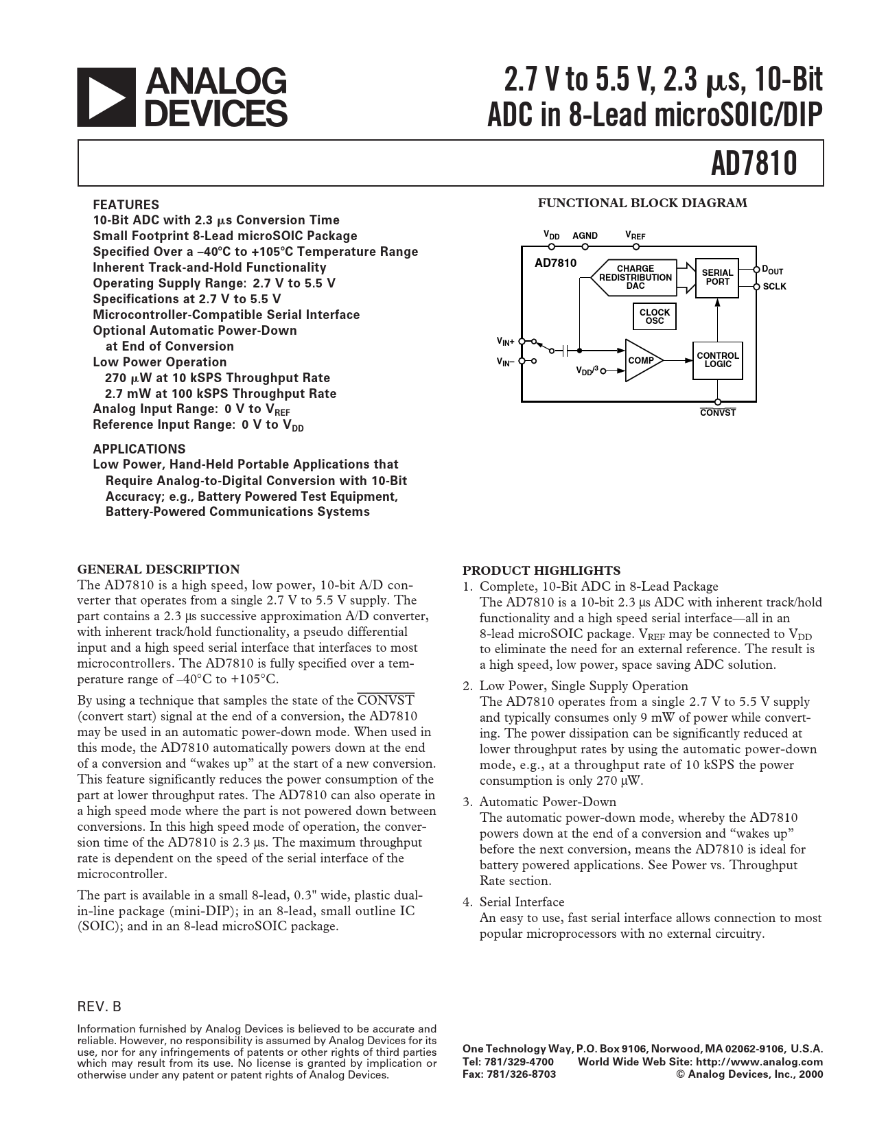 s, 10-Bit ADC in 8-Lead microSOIC/DIP AD7810 FEATURES FUNCTIONAL BLOCK DIAGRAM 10-Bit ADC with 2.3