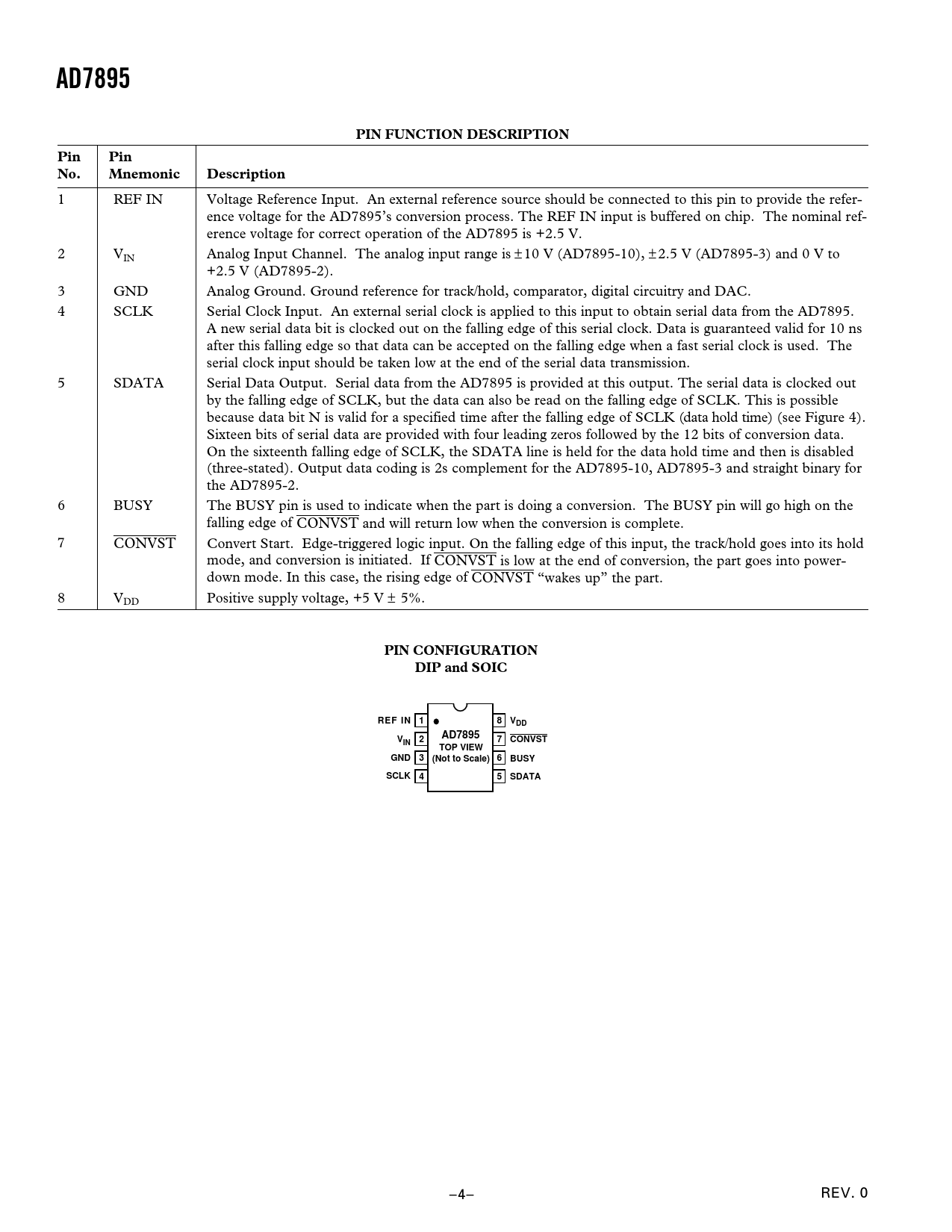 AD7895 PIN FUNCTION DESCRIPTION Pin No Mnemonic Description PIN CONFIGURATION DIP and SOIC REF IN 8 VDD 7 CONVST TOP VIEW GND