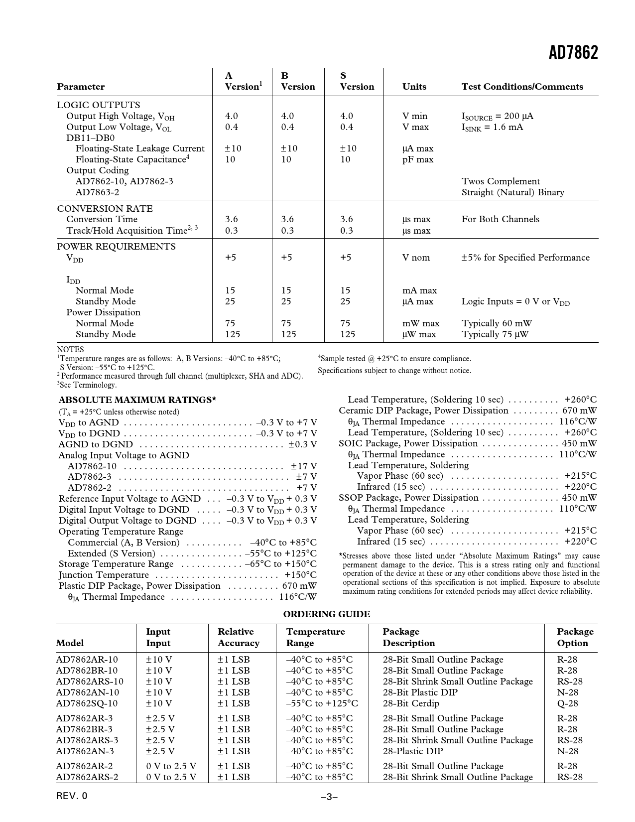 LOGIC OUTPUTS Output High Voltage, VOH 4.0 4.0 4.0 V min ISOURCE = 200 µA Output Low Voltage, VOL 0.4 0.4 0.4 V max ISINK = 1.6 mA DB11–DB0 Floating-State Leakage Current ±10 ±10 ±10 µA max Floating-State Capacitance4 10 10 10 pF max Output Coding AD7862-10, AD7862-3 Twos Complement AD7863-2 Straight (Natural) Binary CONVERSION RATE Conversion Time 3.6 3.6 3.6 µs max For Both Channels Track/Hold Acquisition Time2, 3 0.3 0.3 0.3 µs max POWER REQUIREMENTS VDD +5 +5 +5 V nom ±5% for Specified Performance IDD Normal Mode 15 15 15 mA max Standby Mode 25 25 25 µA max Logic Inputs = 0 V or VDD Power Dissipation Normal Mode 75 75 75 mW max Typically 60 mW Standby Mode 125 125 125 µW max Typically 75 µW NOTES 1Temperature ranges are as follows: A, B Versions: –40°C to +85°C; 4Sample tested @ +25°C to ensure compliance. S Version: –55°C to +125°C. Specifications subject to change without notice. 2 Performance measured through full channel (multiplexer, SHA and ADC). 3See Terminology.