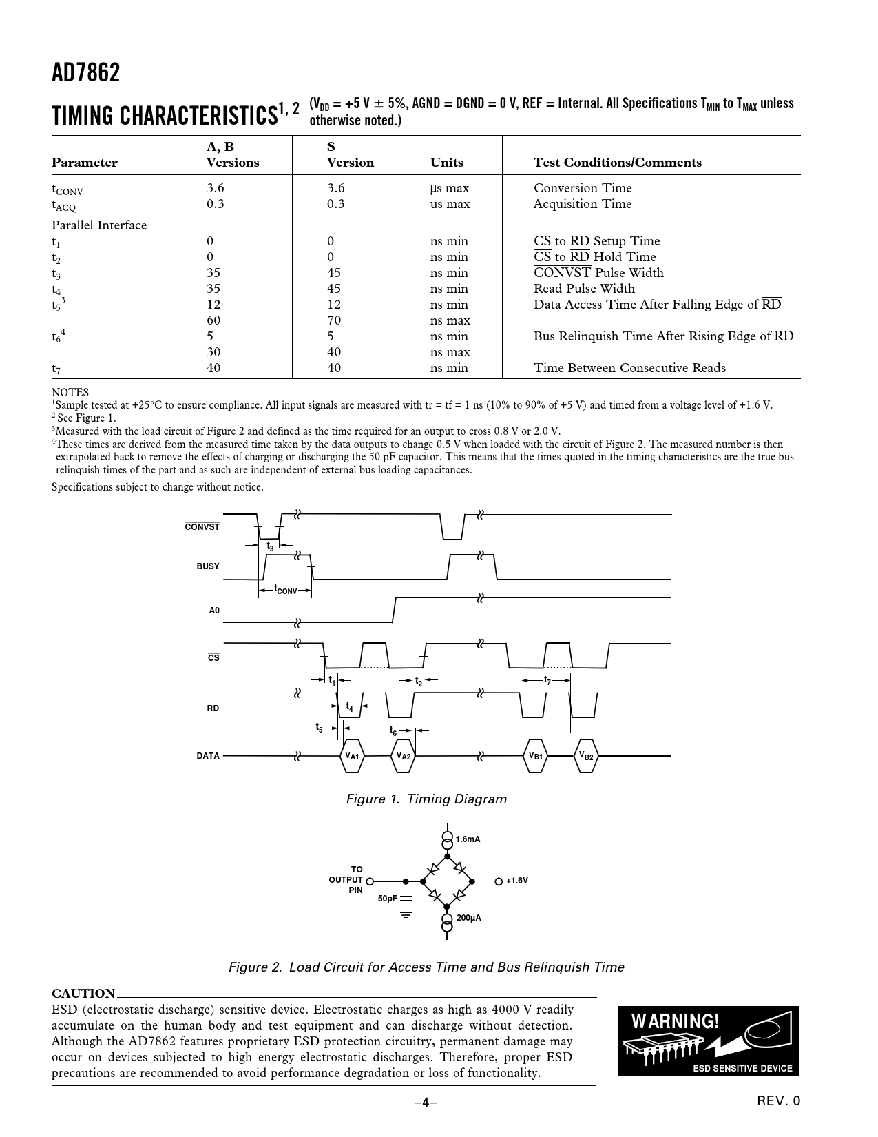 AD7862 TIMING CHARACTERISTICS1, 2 DD = +5 V 5%, AGND = DGND = 0 V, REF = Internal All Specifications TMIN to TMAX unless