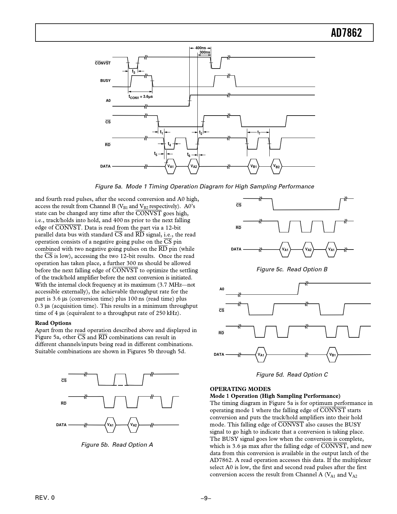 mode. This falling edge of CONVST also causes the BUSY signal to go high to indicate that a conversion is taking place. The BUSY signal goes low when the conversion is complete, Figure 5b. Read Option A which is 3.6 µs max after the falling edge of CONVST, and new data from this conversion is available in the output latch of the AD7862. A read operation accesses this data. If the multiplexer select A0 is low, the first and second read pulses after the first conversion access the result from Channel A (VA1 and VA2 REV. 0 –9–