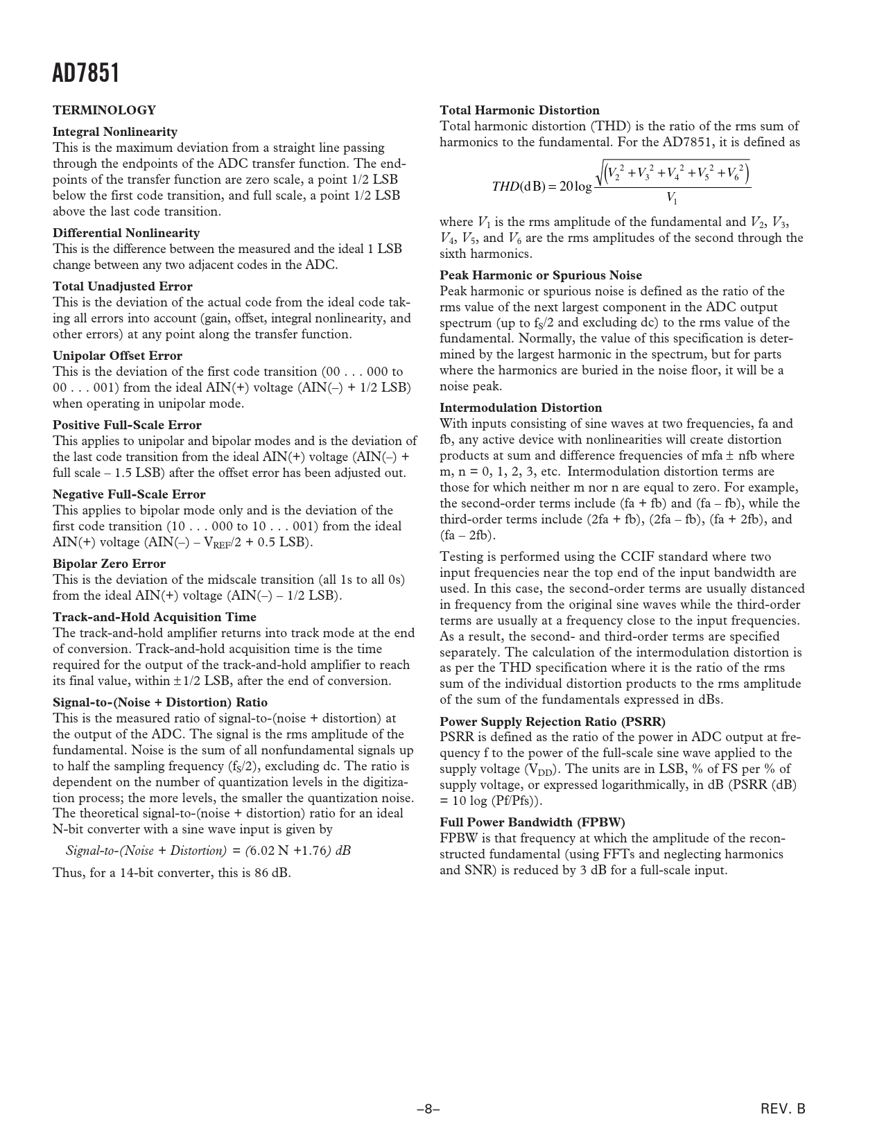 AD7851. TERMINOLOGY. Total Harmonic Distortion. Integral Nonlinearity. Differential Nonlinearity. Peak Harmonic or Spurious Noise