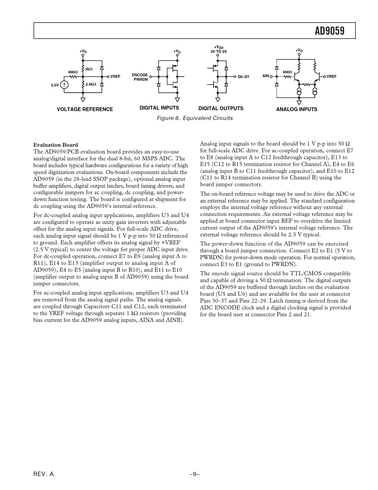 AD9059 +VDD 3V TO 5V 800 500 ENCODE VREF D0–D7 AIN PWRDN 2.5k 2.5V DIGITAL INPUTS VOLTAGE REFERENCE DIGITAL OUTPUTS ANALOG INPUTS