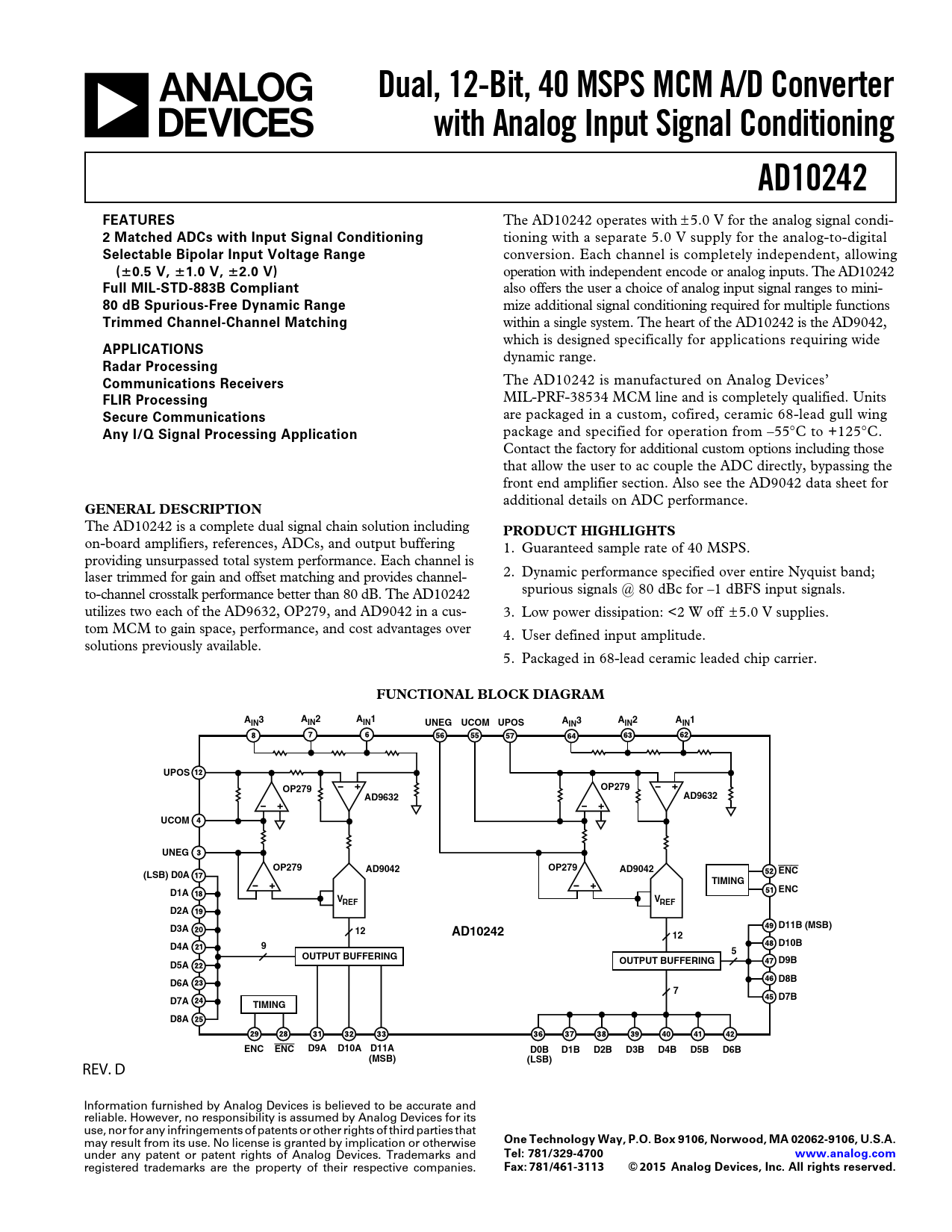 | Description | Dual Channel, 12-Bit, 40 MSPS MCM A/D Converter with DC-Coupled Analog Input Signal Conditioning (AD9042 Core ADC) |