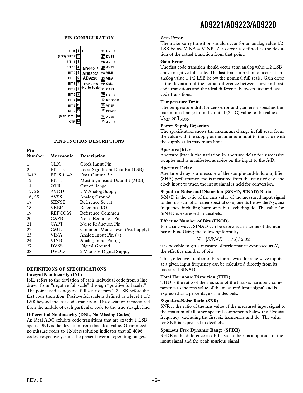 AD9221/AD9223/AD9220. PIN CONFIGURATION. Zero Error. CLK 1. 28 DVDD. (LSB) BIT 12 2. 27 DVSS. BIT 11 3. 26 AVDD. Gain Error. BIT 10 4