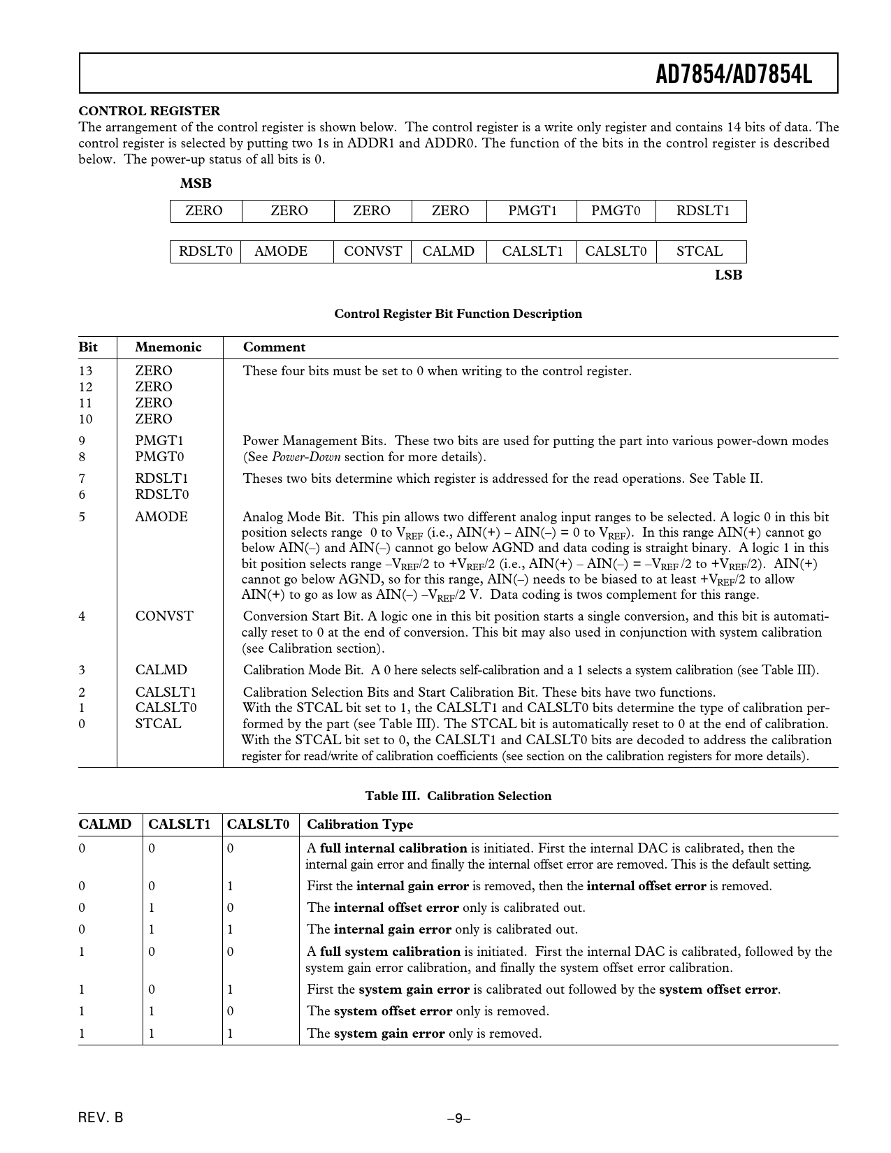 13 ZERO These four bits must be set to 0 when writing to the control register. 12 ZERO 11 ZERO 10 ZERO 9 PMGT1 Power Management Bits. These two bits are used for putting the part into various power-down modes 8 PMGT0 (See Power-Down section for more details). 7 RDSLT1 Theses two bits determine which register is addressed for the read operations. See Table II. 6 RDSLT0 5 AMODE Analog Mode Bit. This pin allows two different analog input ranges to be selected. A logic 0 in this bit position selects range 0 to VREF (i.e., AIN(+) – AIN(–) = 0 to VREF). In this range AIN(+) cannot go below AIN(–) and AIN(–) cannot go below AGND and data coding is straight binary. A logic 1 in this bit position selects range –VREF/2 to +VREF/2 (i.e., AIN(+) – AIN(–) = –VREF /2 to +VREF/2). AIN(+) cannot go below AGND, so for this range, AIN(–) needs to be biased to at least +VREF/2 to allow AIN(+) to go as low as AIN(–) –VREF/2 V. Data coding is twos complement for this range. 4 CONVST Conversion Start Bit. A logic one in this bit position starts a single conversion, and this bit is automati- cally reset to 0 at the end of conversion. This bit may also used in conjunction with system calibration (see Calibration section). 3 CALMD Calibration Mode Bit. A 0 here selects self-calibration and a 1 selects a system calibration (see Table III). 2 CALSLT1 Calibration Selection Bits and Start Calibration Bit. These bits have two functions. 1 CALSLT0 With the STCAL bit set to 1, the CALSLT1 and CALSLT0 bits determine the type of calibration per- 0 STCAL formed by the part (see Table III). The STCAL bit is automatically reset to 0 at the end of calibration. With the STCAL bit set to 0, the CALSLT1 and CALSLT0 bits are decoded to address the calibration register for read/write of calibration coefficients (see section on the calibration registers for more details).
