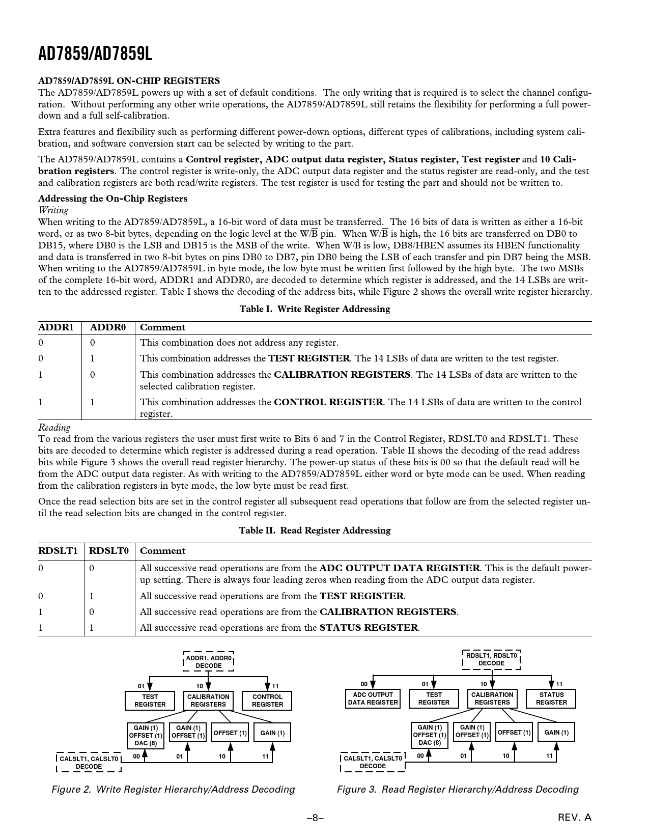 . The 14 LSBs of data are written to the control register. Reading To read from the various registers the user must first write to Bits 6 and 7 in the Control Register, RDSLT0 and RDSLT1. These bits are decoded to determine which register is addressed during a read operation. Table II shows the decoding of the read address bits while Figure 3 shows the overall read register hierarchy. The power-up status of these bits is 00 so that the default read will be from the ADC output data register. As with writing to the AD7859/AD7859L either word or byte mode can be used. When reading from the calibration registers in byte mode, the low byte must be read first. Once the read selection bits are set in the control register all subsequent read operations that follow are from the selected register un- til the read selection bits are changed in the control register.