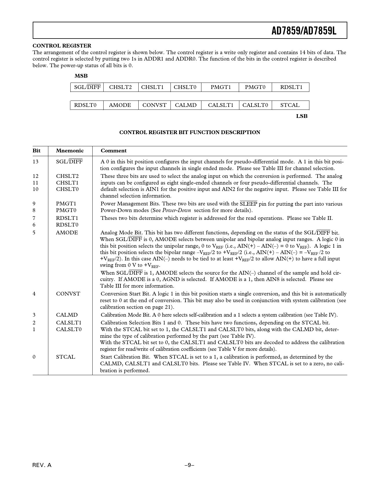 AD7859/AD7859L CONTROL REGISTER MSB LSB CONTROL REGISTER BIT FUNCTION DESCRIPTION Bit Mnemonic Comment