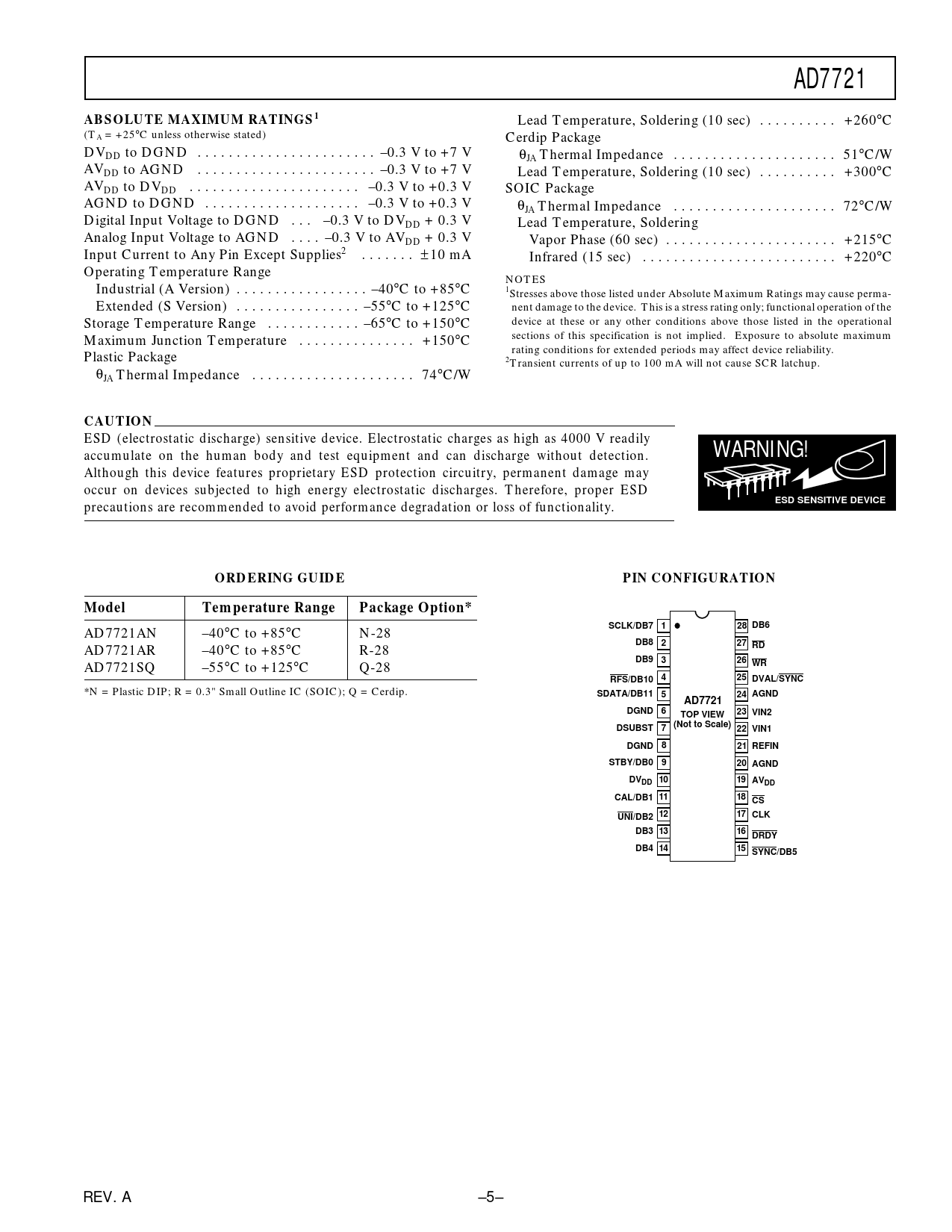 AD7721. ABSOLUTE MAXIMUM RATINGS1. CAUTION. WARNING!. ESD SENSITIVE DEVICE. ORDERING GUIDE. PIN CONFIGURATION. Model. Temperature Range