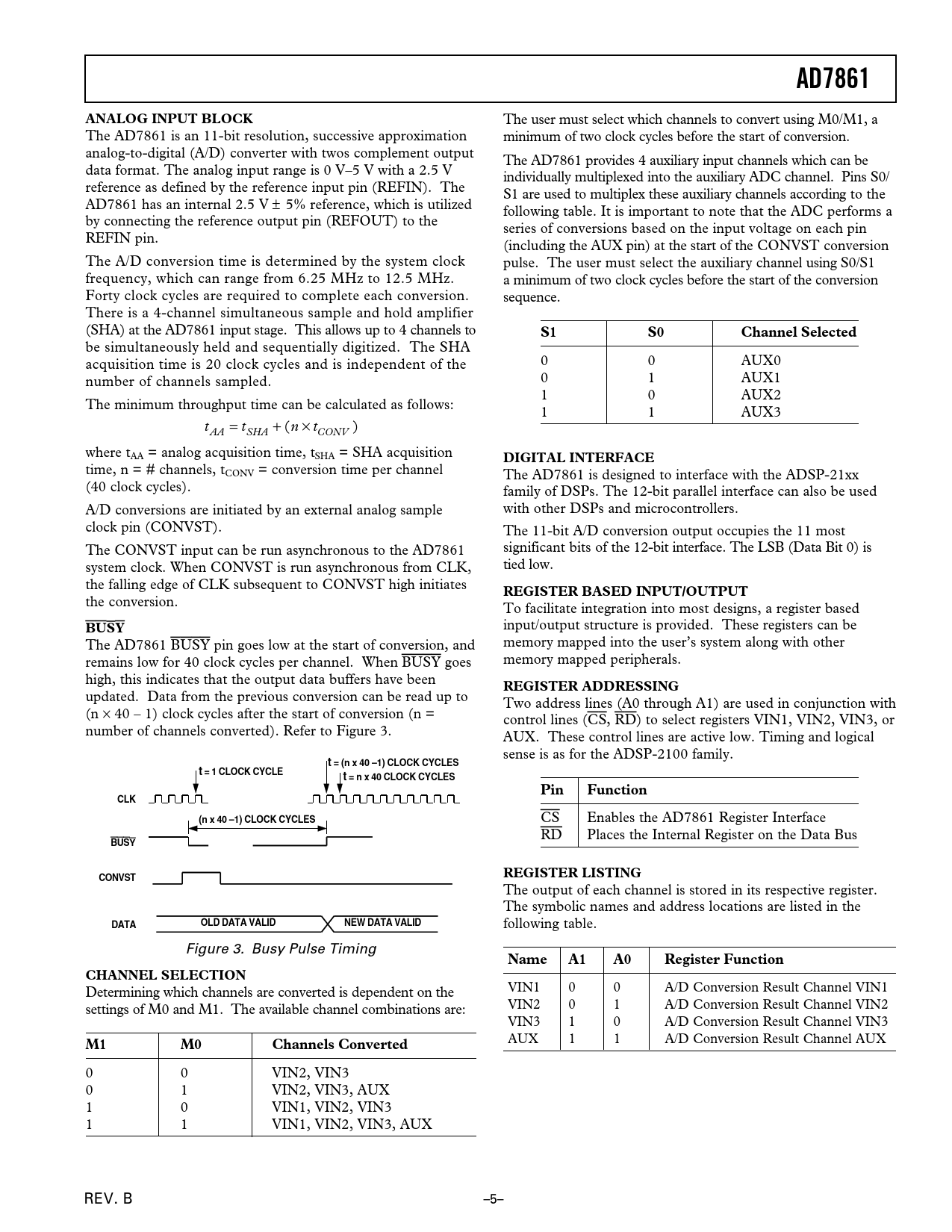 AD7861 ANALOG INPUT BLOCK Channel Selected DIGITAL INTERFACE REGISTER BASED INPUT/OUTPUT BUSY REGISTER ADDRESSING